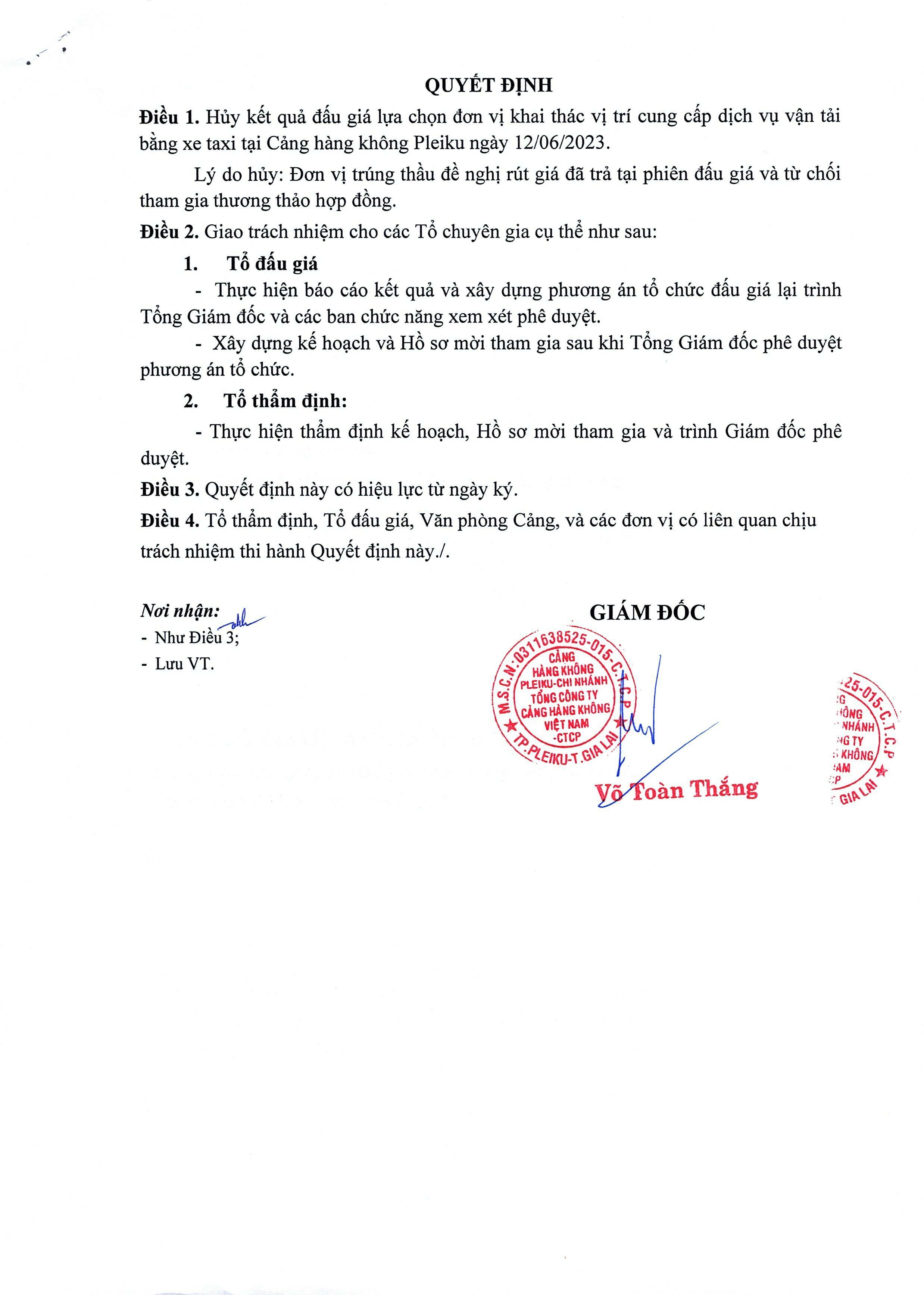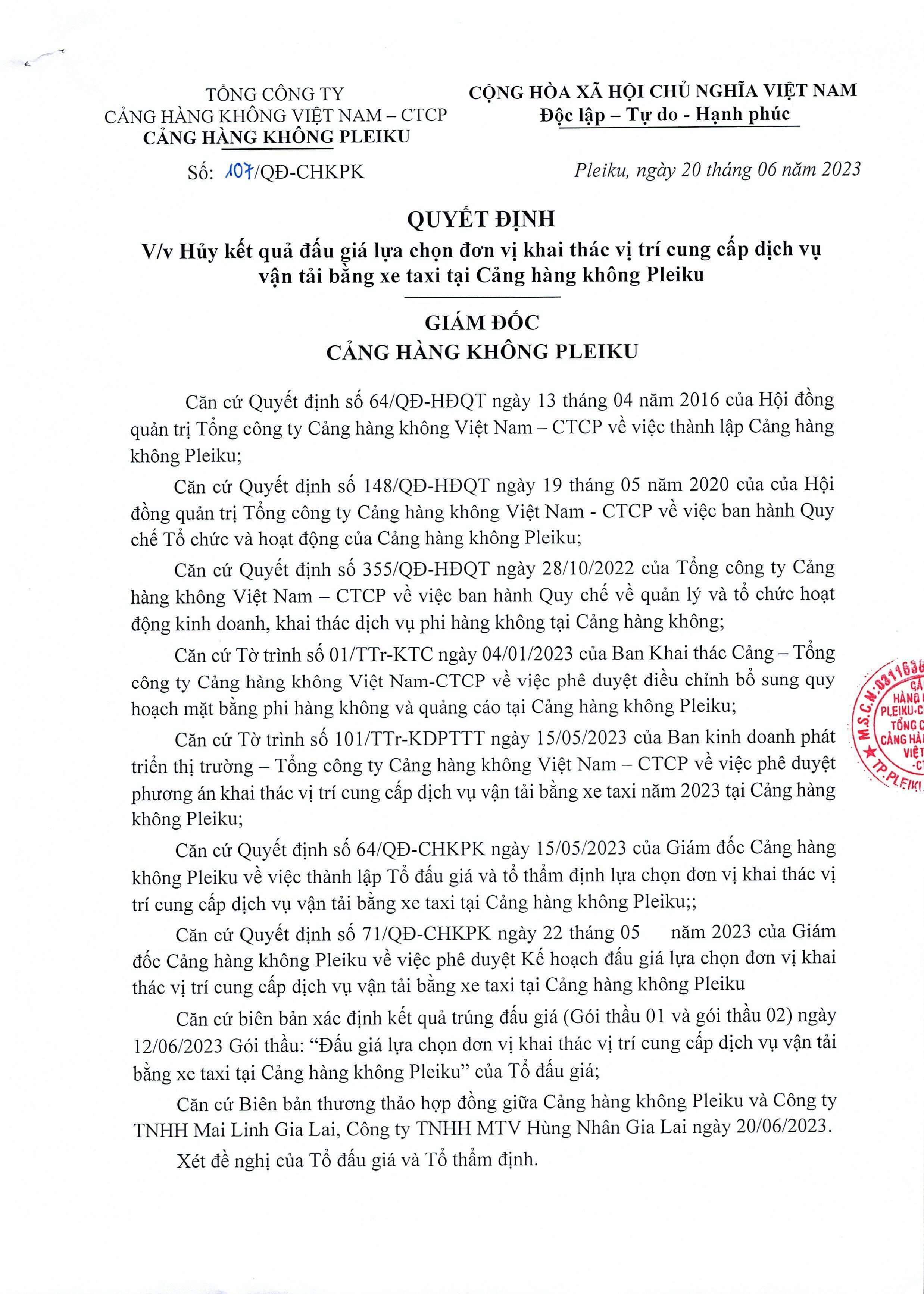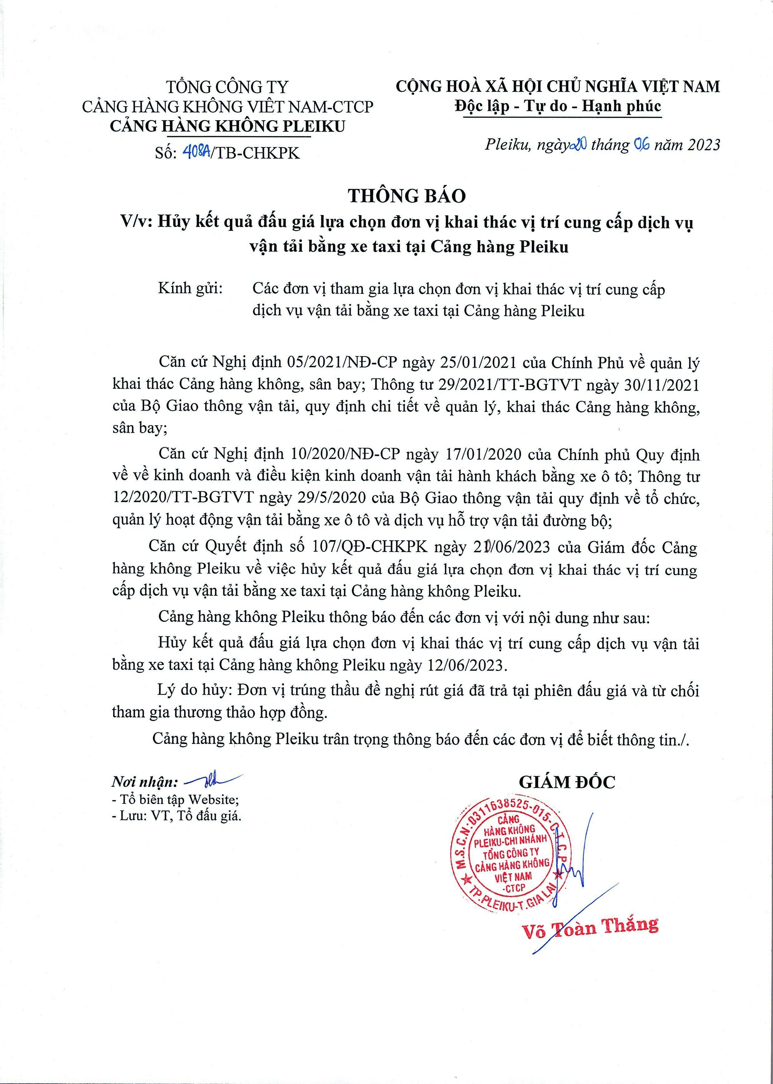 Thông báo Hủy kết đấu giá lựa chọn đơn vị khai thác vị trí cung cấp dịch vụ vận tải bằng xe taxi tại Cảng hàng không Pleiku