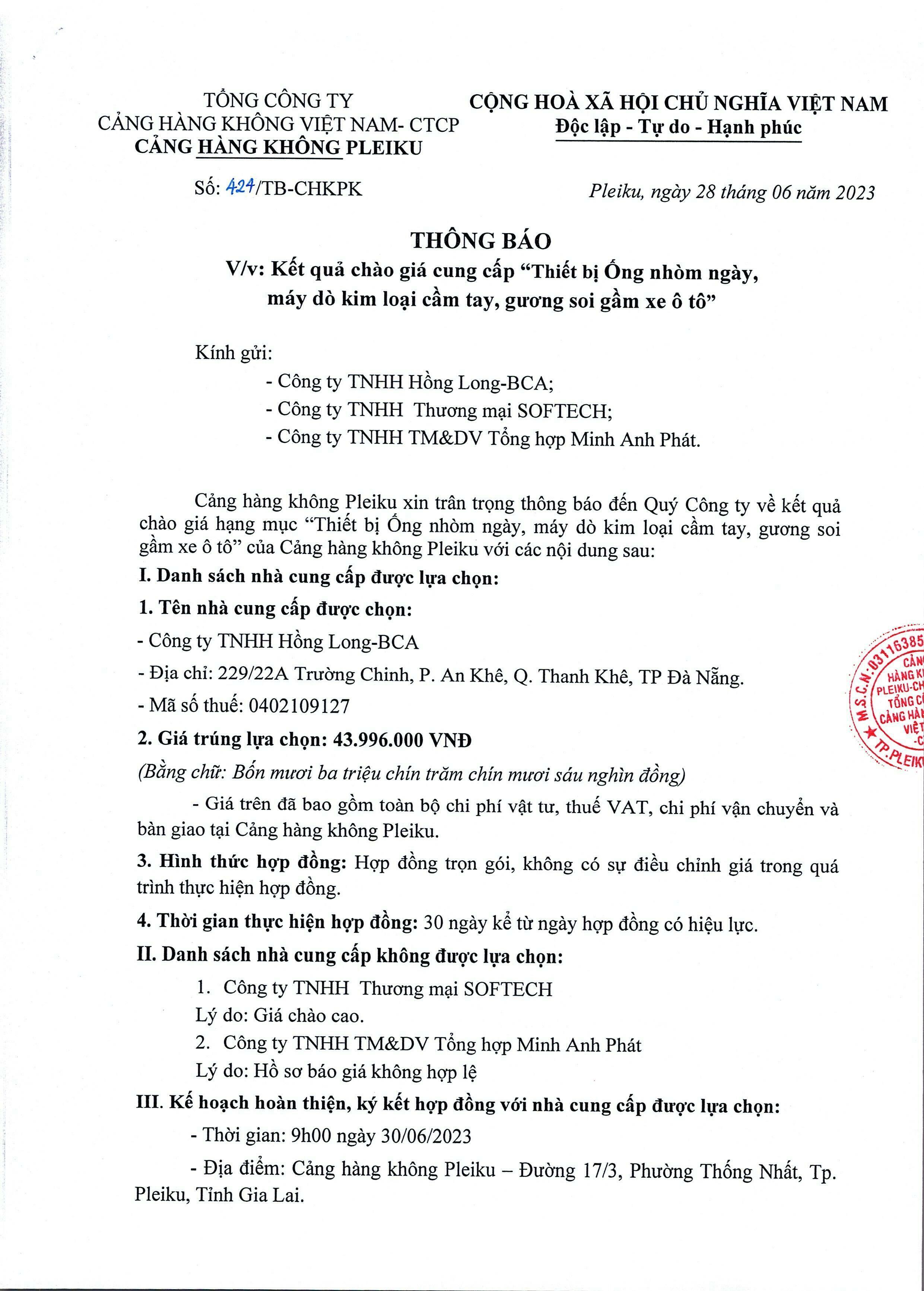 Thông báo về việc Kết quả chào giá "Sửa chữa, cải tạo hệ thống cấp mạng SCN tại phòng kỹ thuật - Nhà ga hành khách Cảng hàng không Pleiku"