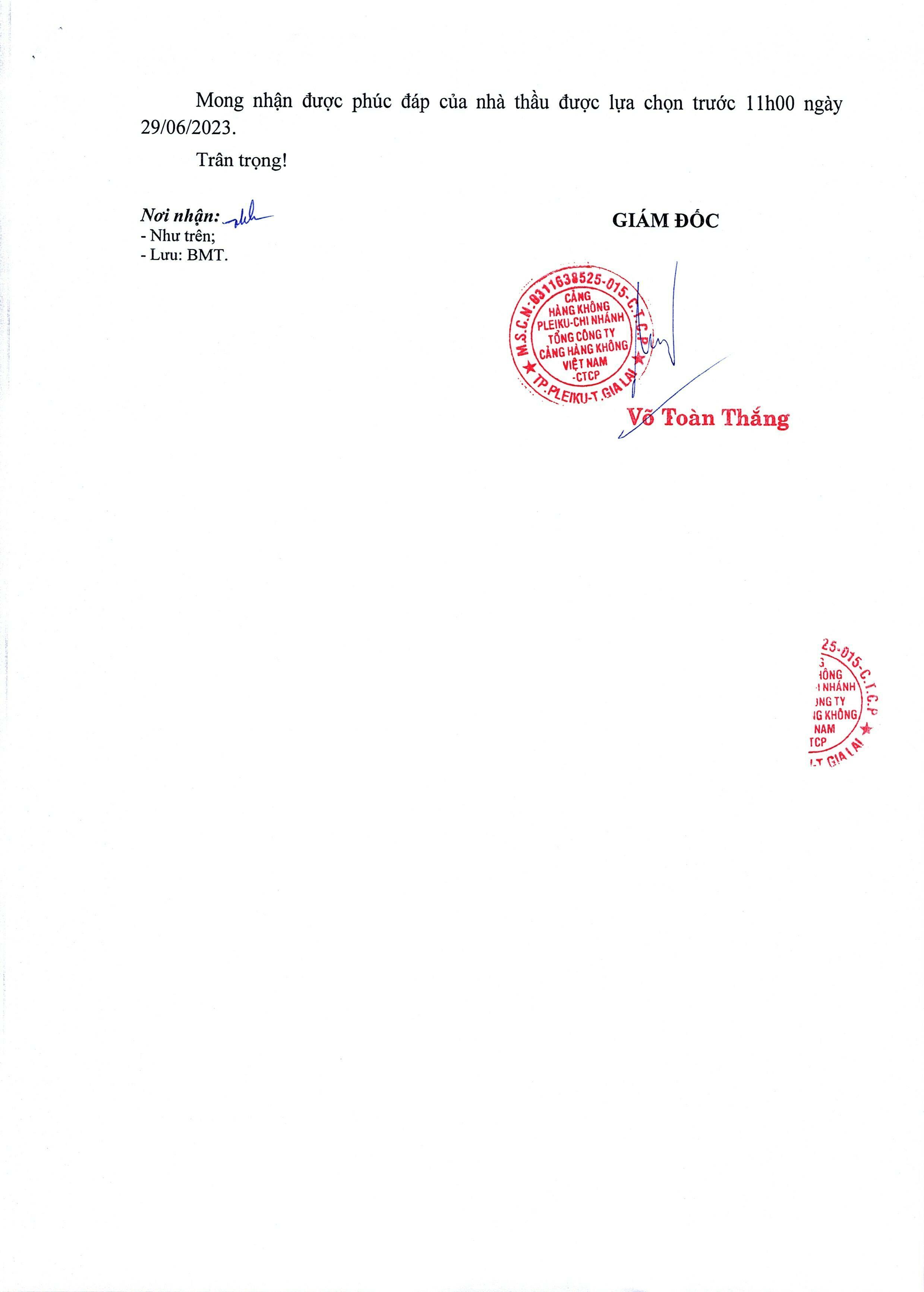 Thông báo mời chào giá vệ sinh nhà điều hành và nhà ga hành khách Cảng hàng không Pleiku
