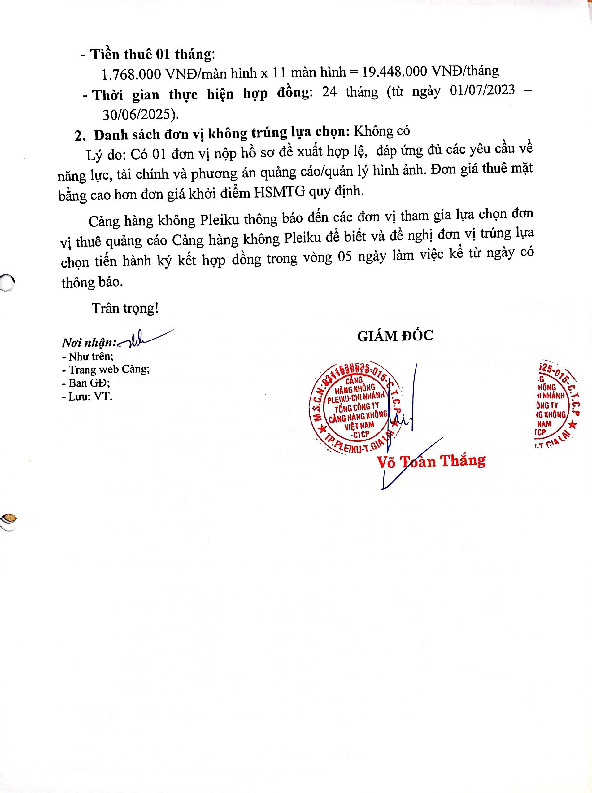 Thông báo kết quả lựa chọn đơn vị thuê mặt bằng quảng trên màn hình LCD tại Cảng hàng không Pleiku