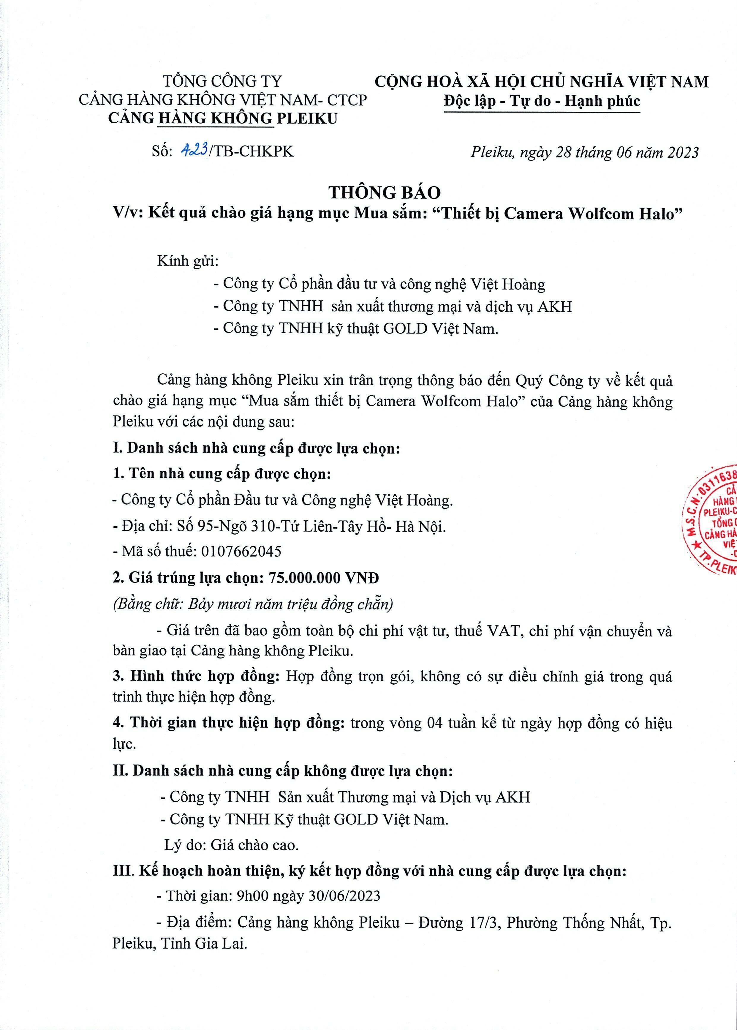 Thông báo về việc Kết quả chào giá "Sửa chữa, cải tạo hệ thống cấp mạng SCN tại phòng kỹ thuật - Nhà ga hành khách Cảng hàng không Pleiku"