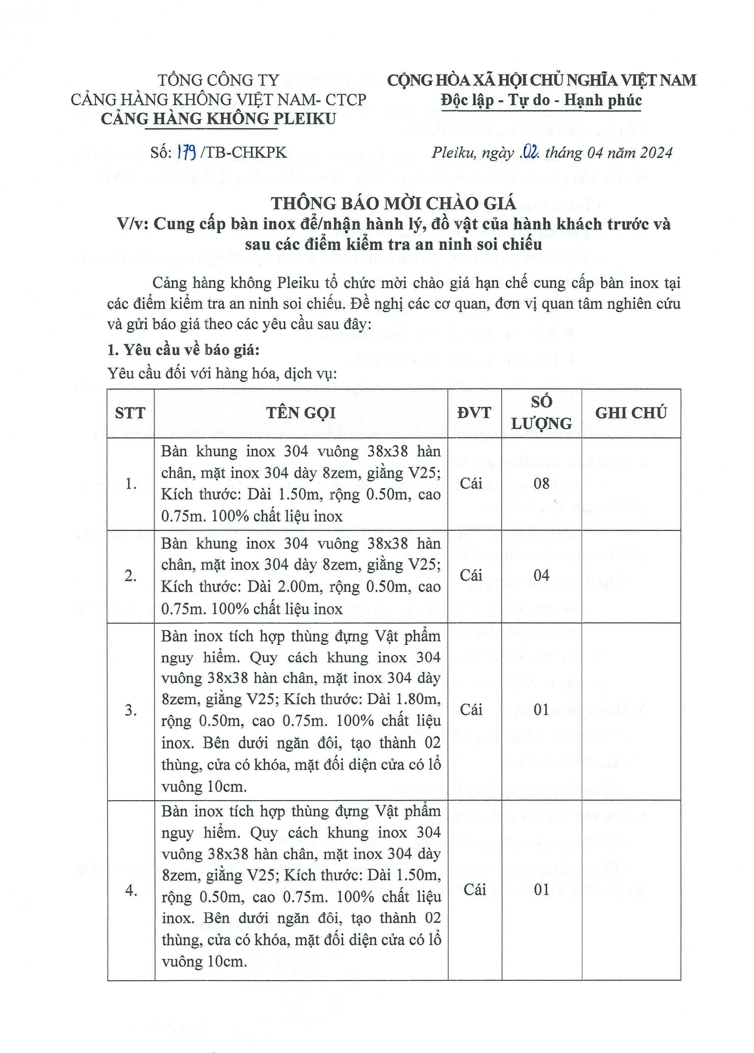 Thông báo mời chào giá: Cung cấp bàn để/nhận hành lý, đồ vật của hành khách trước và sau các điểm kiểm tra an ninh soi chiếu