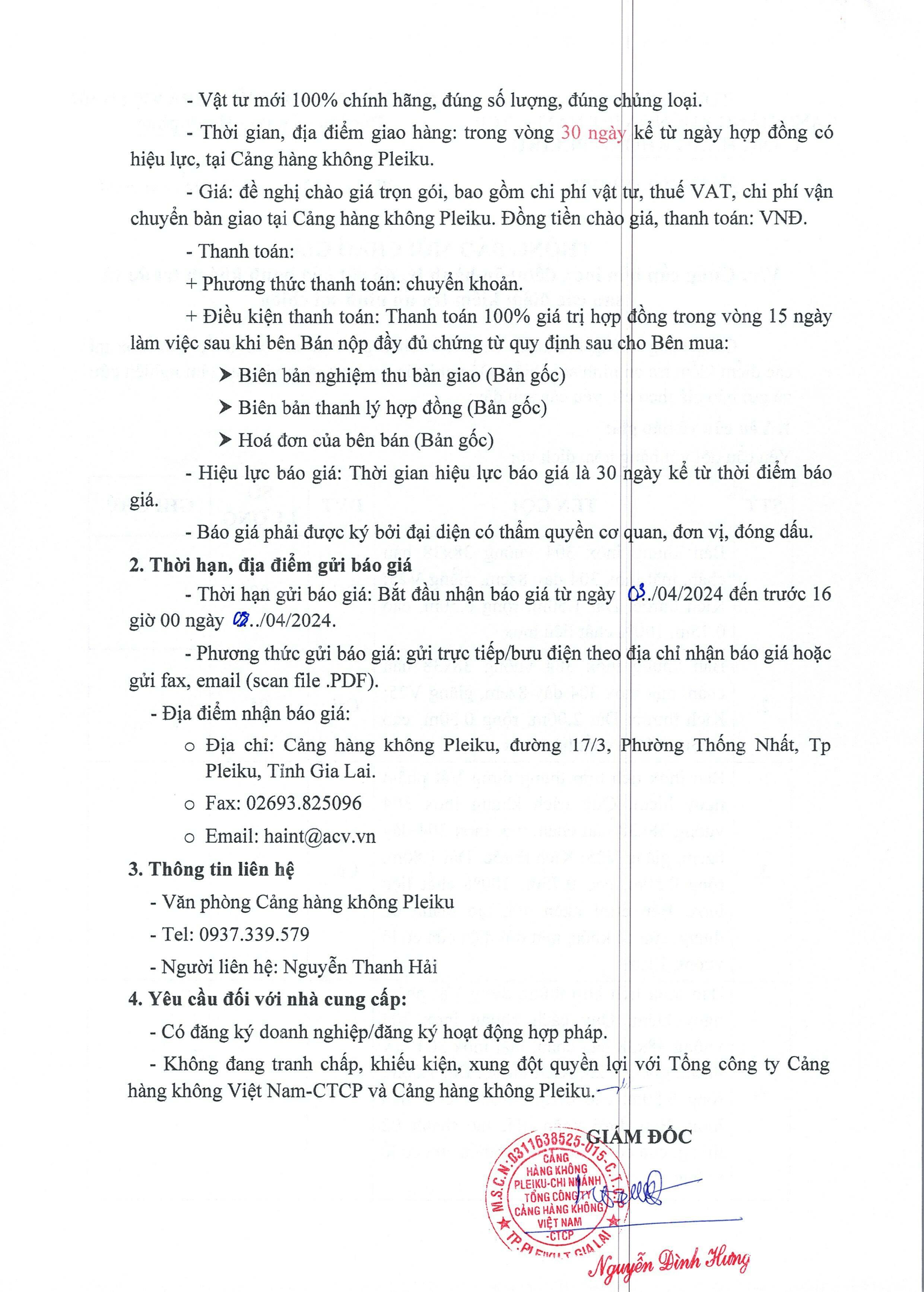 Thông báo mời chào giá về việc "Sửa chữa, cải tạo hệ thống cáp mạng SCN tại phòng kỹ thuật - Nhà ga hành khách Cảng hàng không Pleiku"