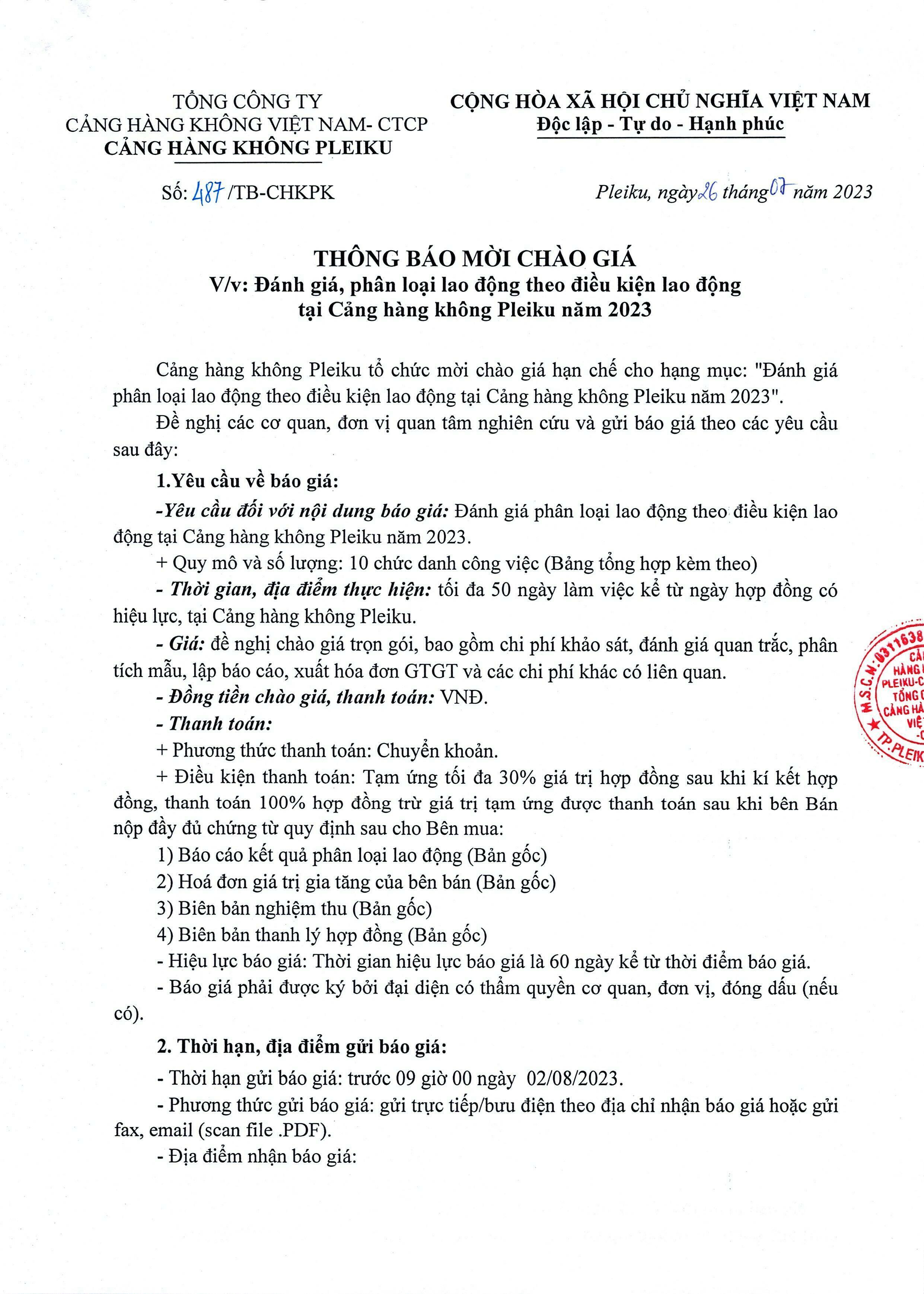 Thông báo mời chào giá: Đánh giá, phân loại lao động theo điều kiện lao động tại Cảng hàng không Pleiku năm 2023