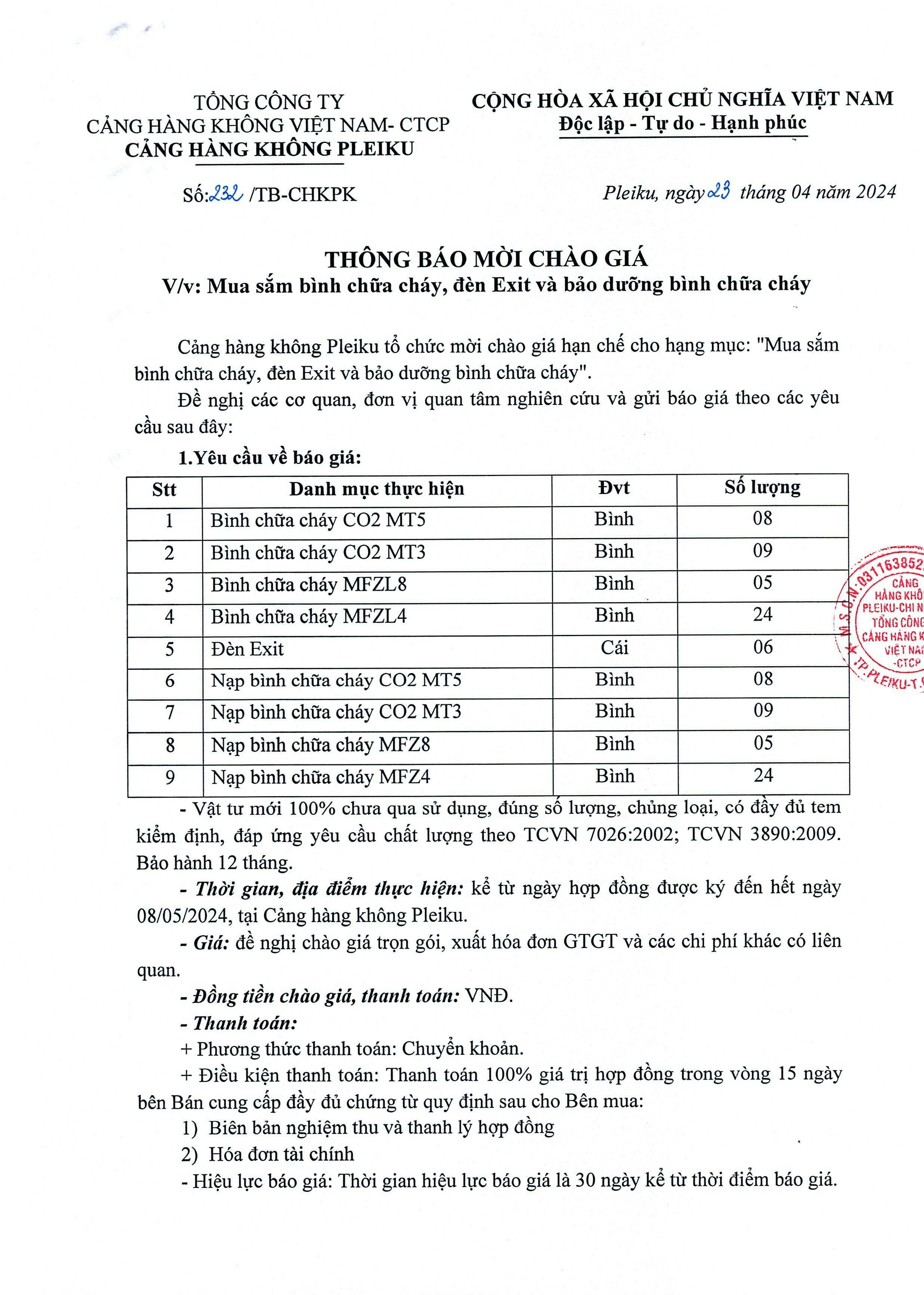 Thông báo mời chào giá: Mua sắm bình chữa cháy, đèn exit và bảo dưỡng bình chữa cháy