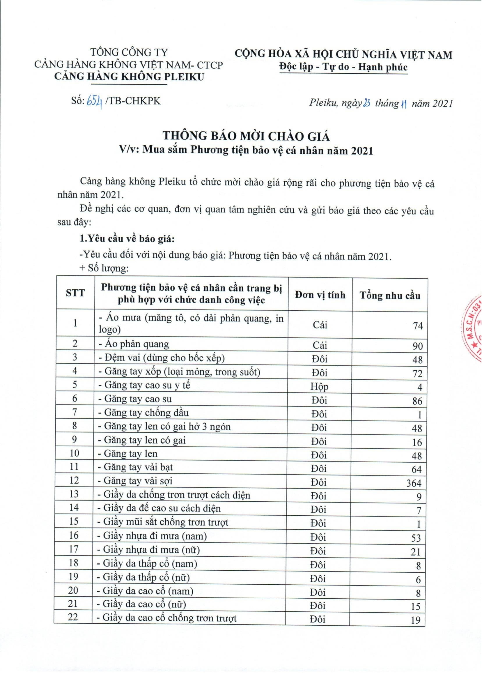 Thông báo mời chào giá: Mua sắm phương tiện bảo vệ cá nhân năm 2021