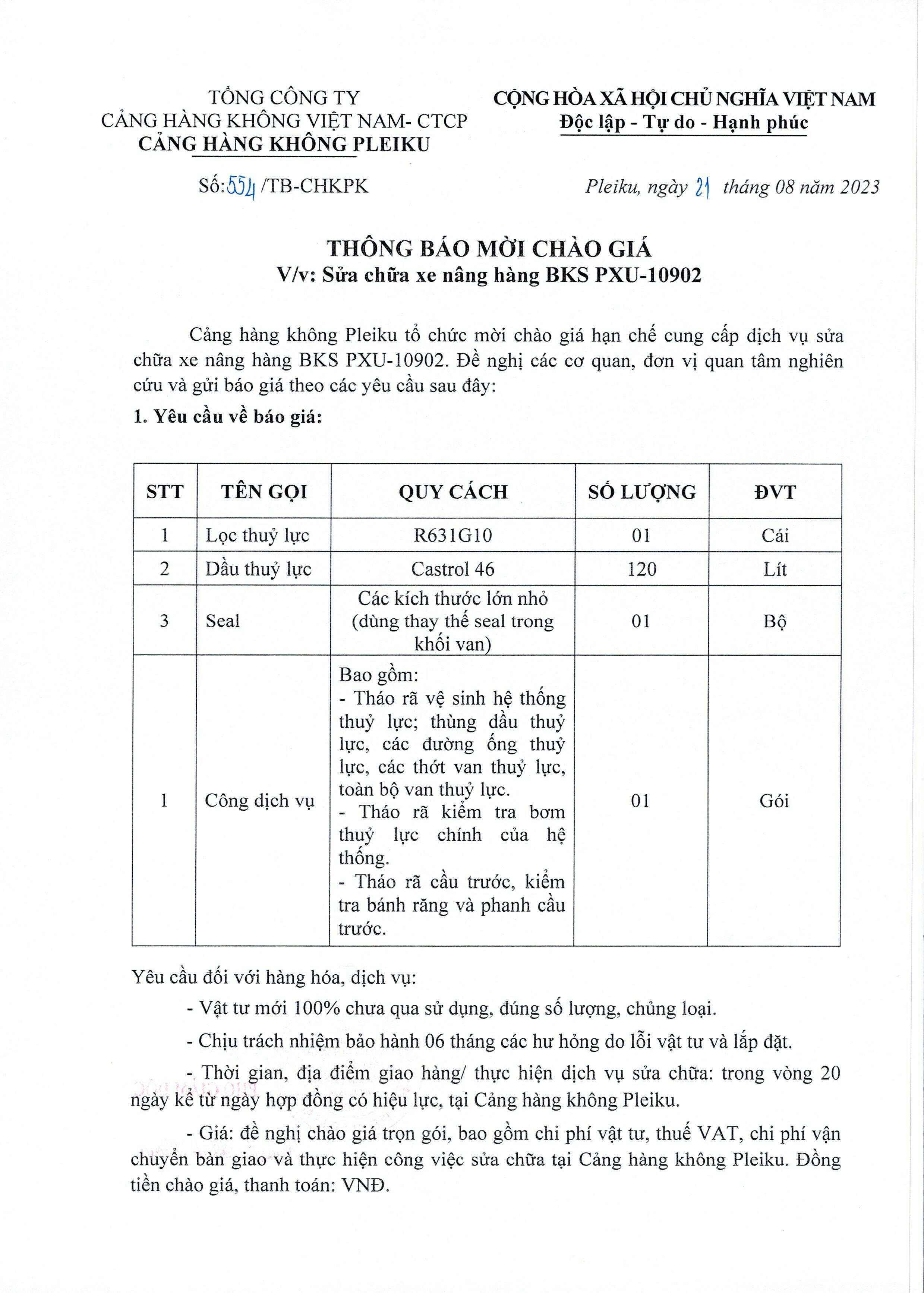 Thông báo mời chào giá: Sửa chữa xe nâng hàng BKS PXU - 10902