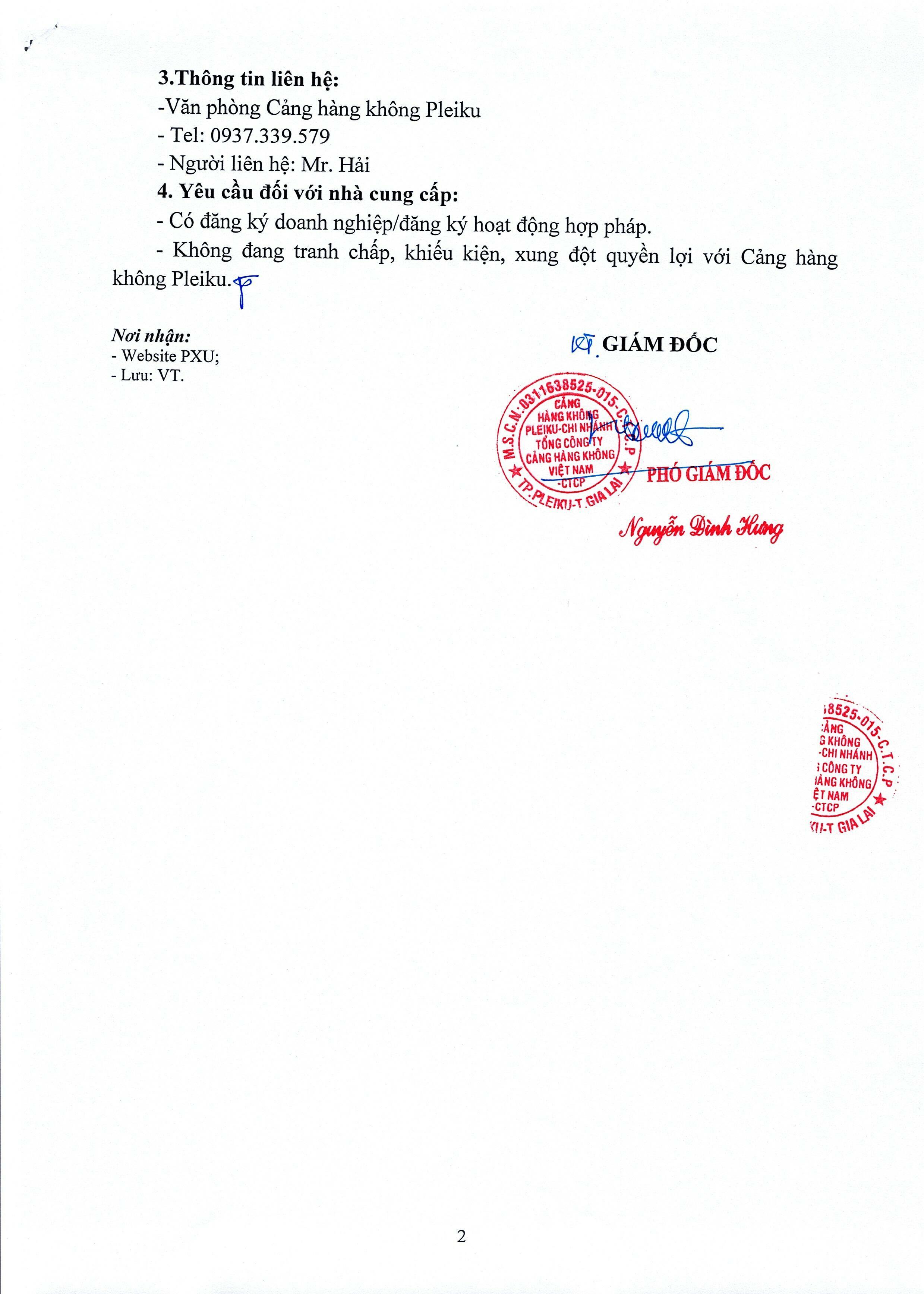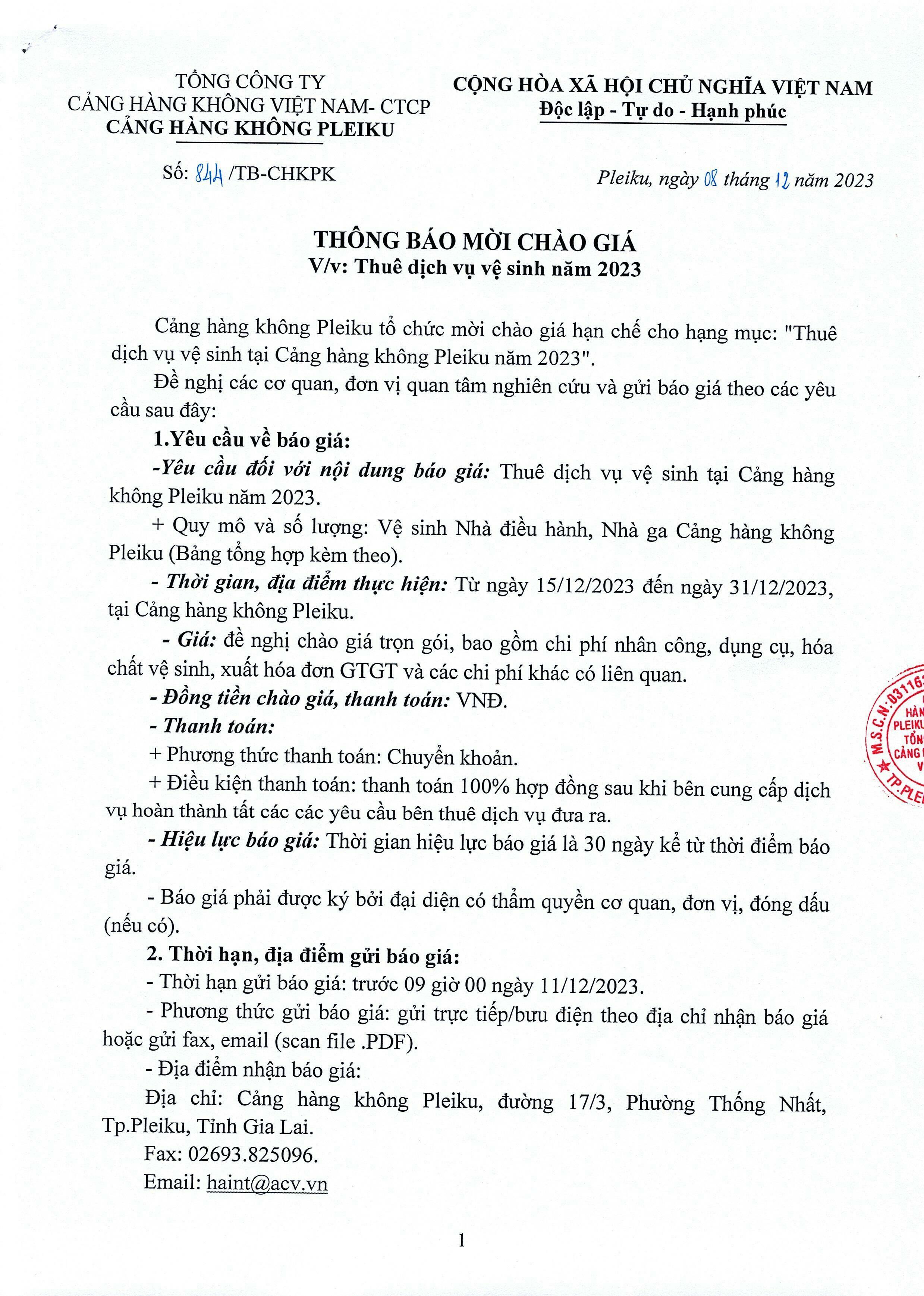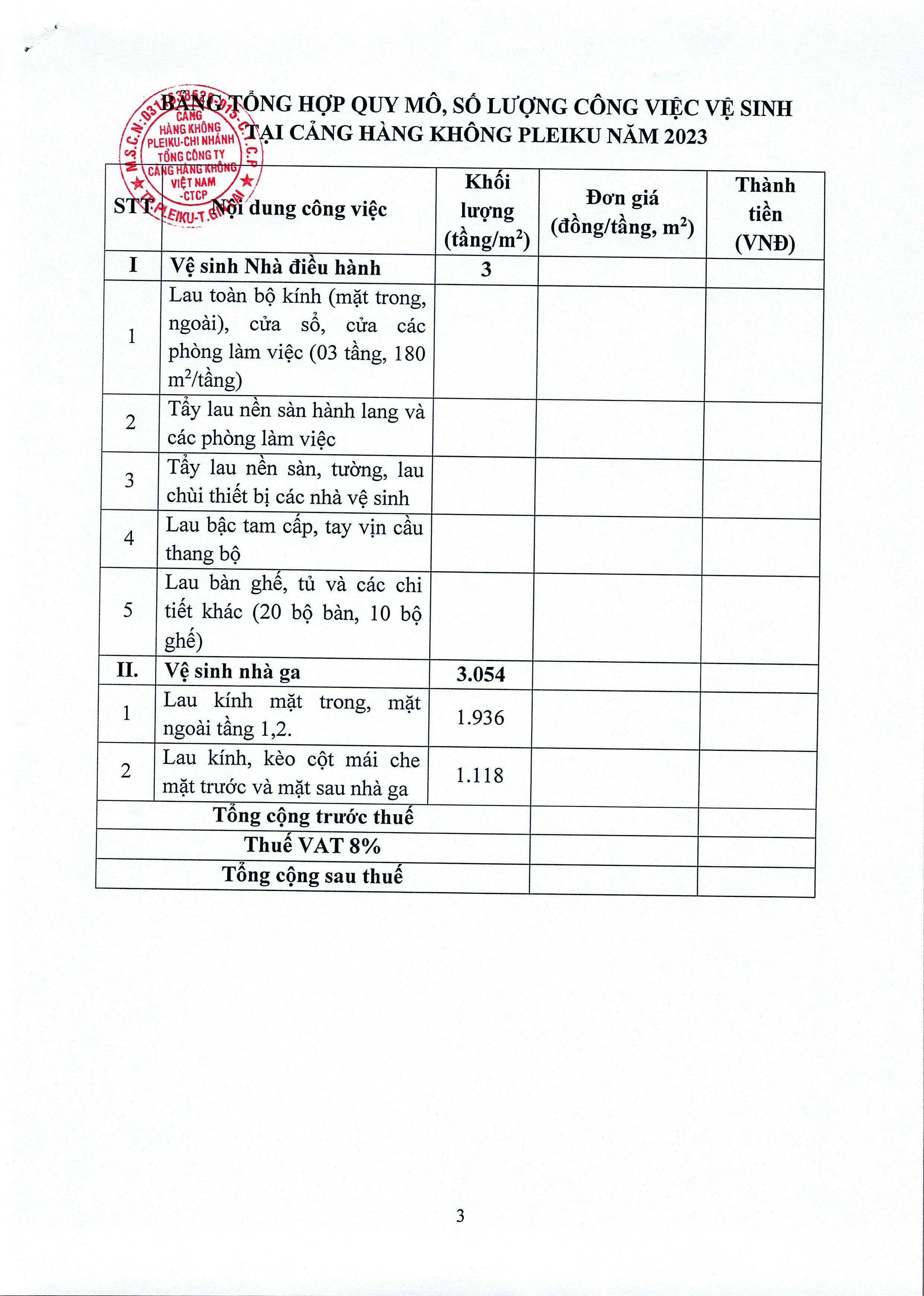 Thông báo mời chào giá vệ sinh nhà điều hành và nhà ga hành khách Cảng hàng không Pleiku