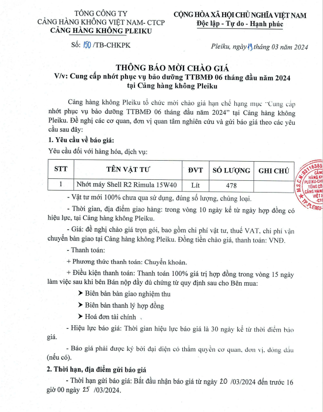 Thông báo mời chào giá về việc "Cung cấp nhớt phục vụ bảo dưỡng TTBMĐ 06 tháng đầu năm 2024 tại Cảng hàng không Pleiku"