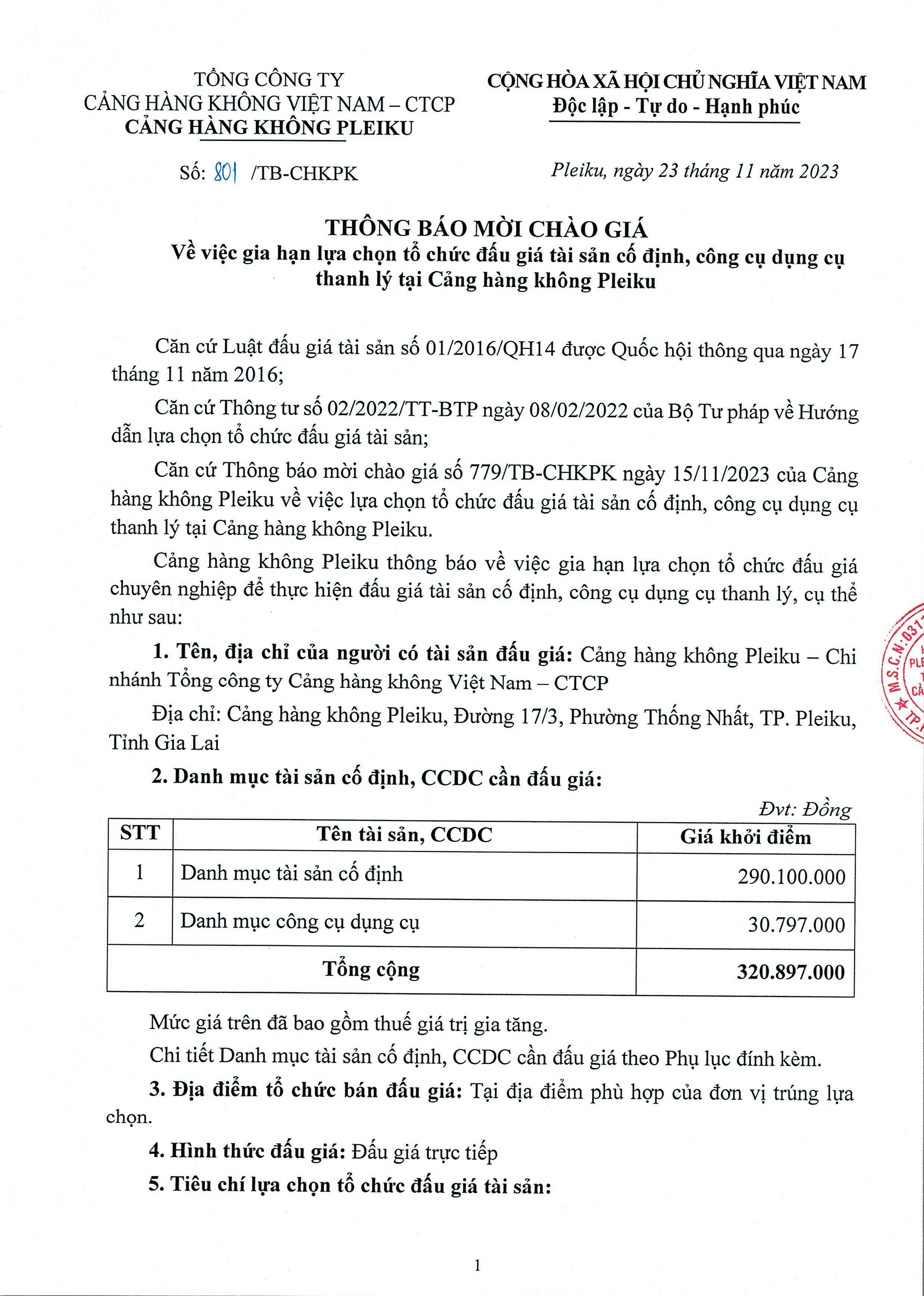 Thông báo mời chào giá: Về việc gia hạn lựa chọn tổ chức đấu giá tài sản cố định, công cụ dụng cụ thanh lý tại Cảng hàng không