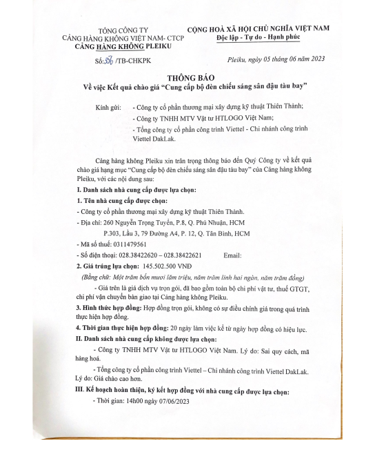 Thông báo về việc Kết quả mời chào giá "Cung cấp bộ đèn chiếu sáng sân đậu tàu bay"
