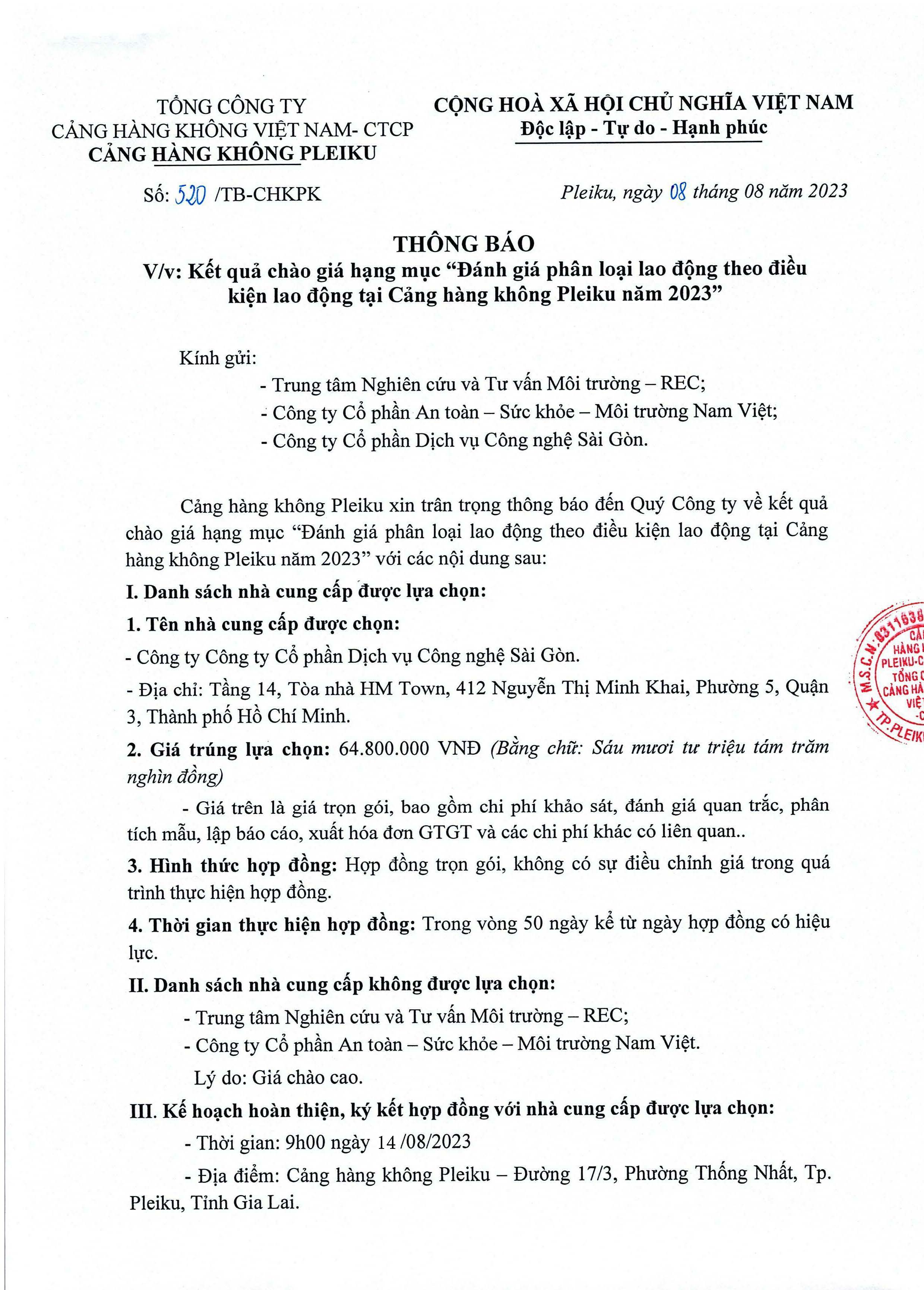 Thông kết quả báo mời chào giá: Đánh giá, phân loại lao động theo điều kiện lao động tại Cảng hàng không Pleiku năm 2023