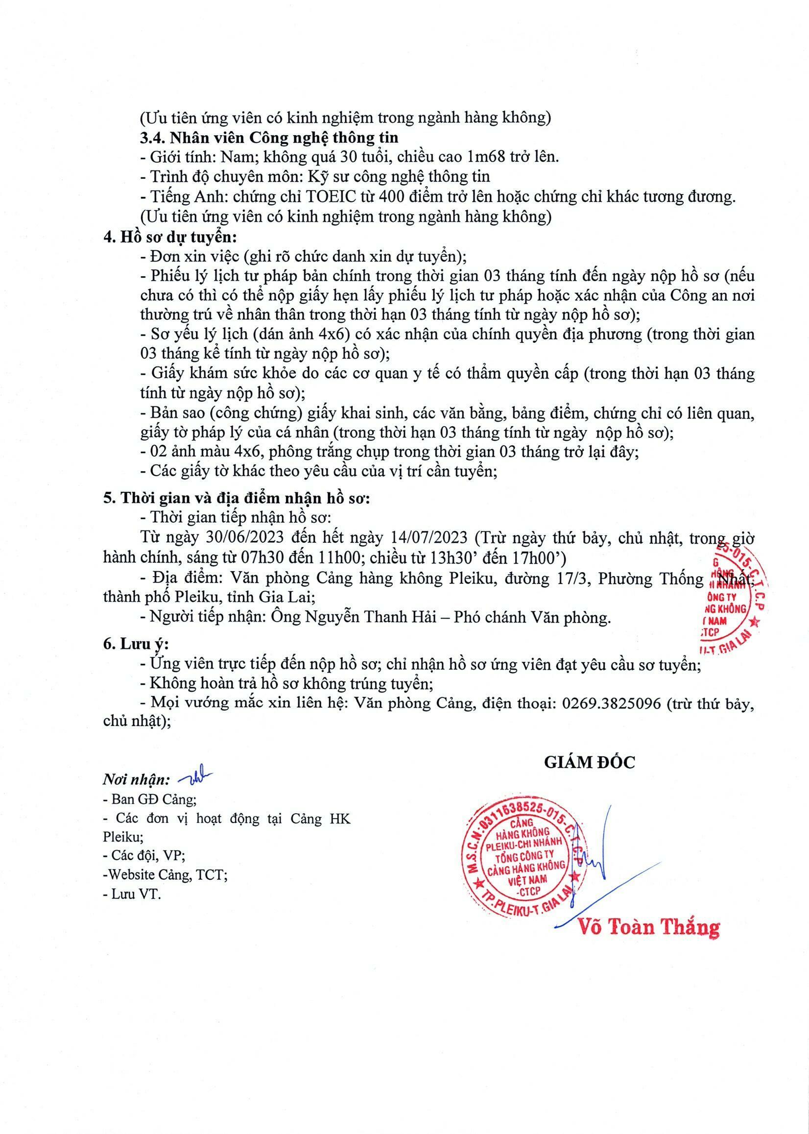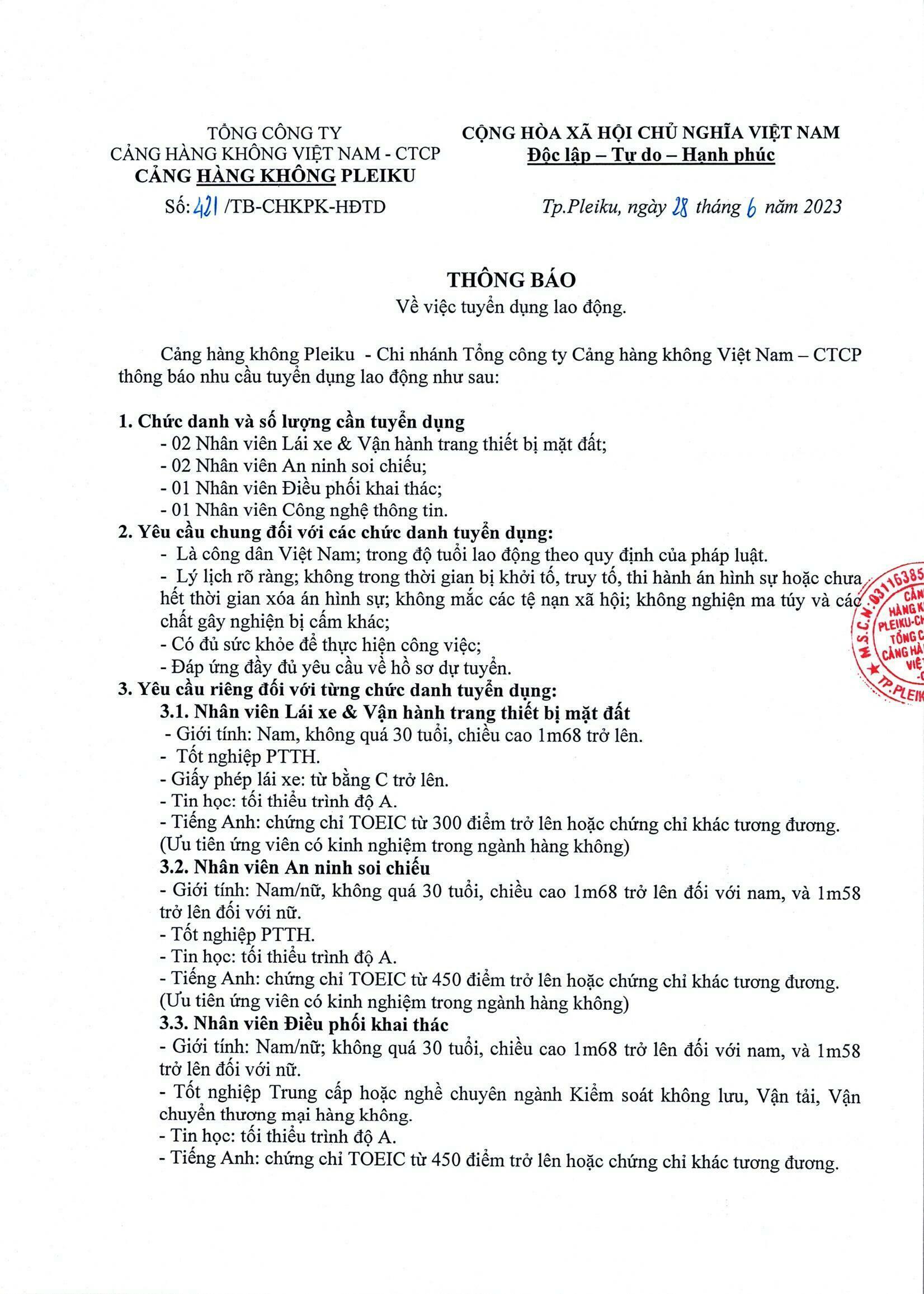 CẢNG HÀNG KHÔNG PLEIKU THÔNG BÁO TUYỂN DỤNG LAO ĐỘNG