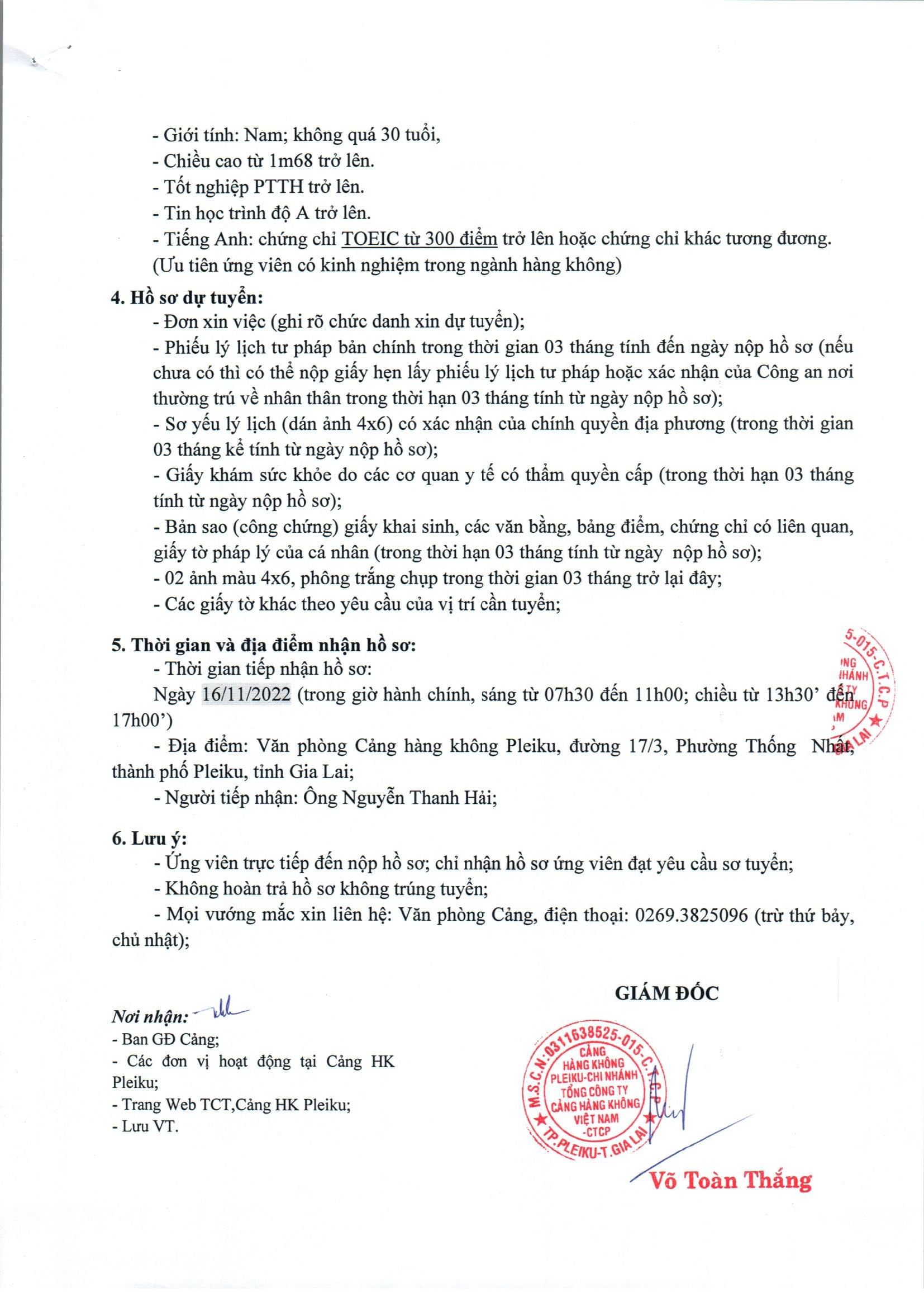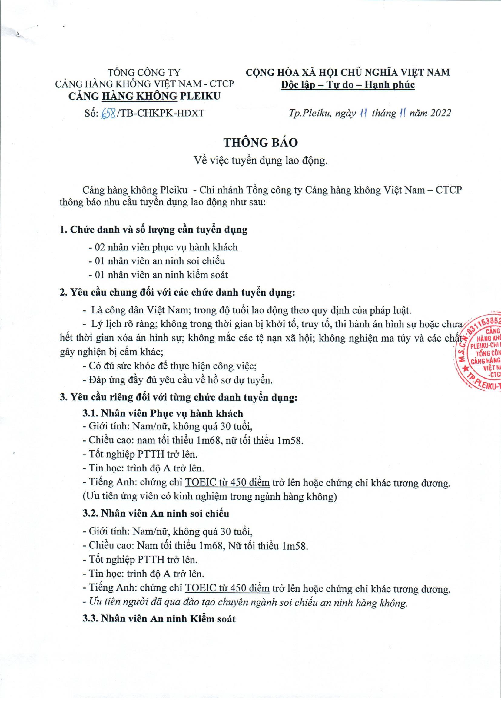 CẢNG HÀNG KHÔNG PLEIKU THÔNG BÁO TUYỂN DỤNG LAO ĐỘNG NĂM 2022