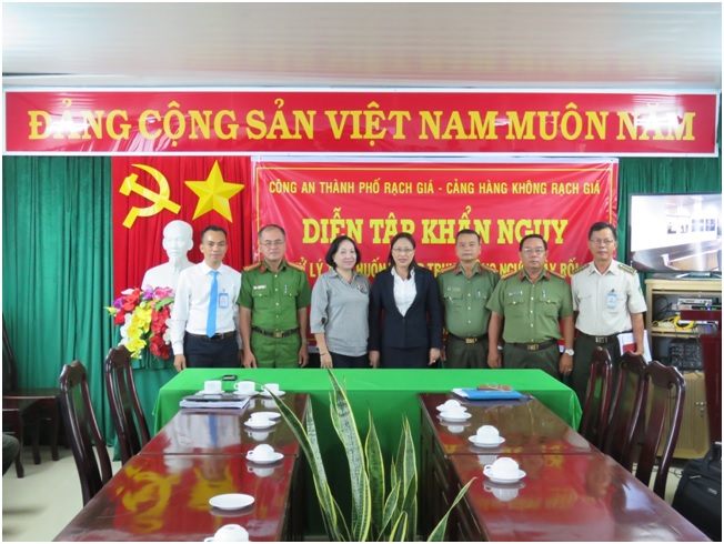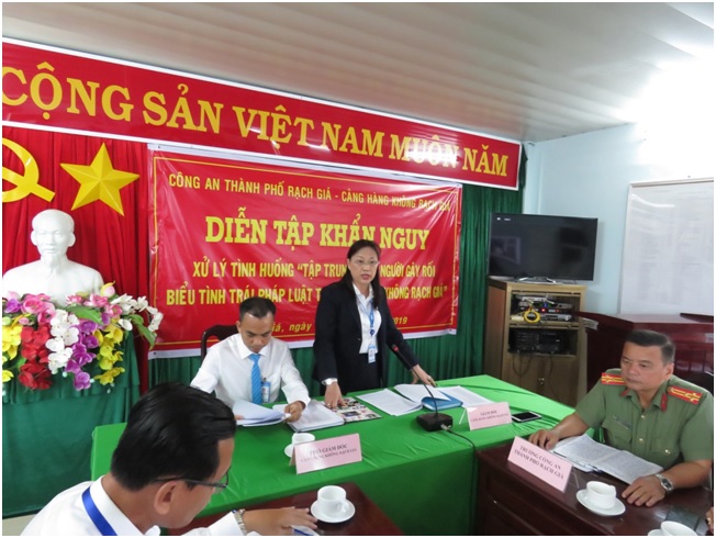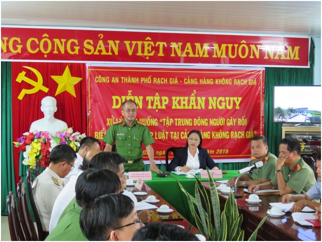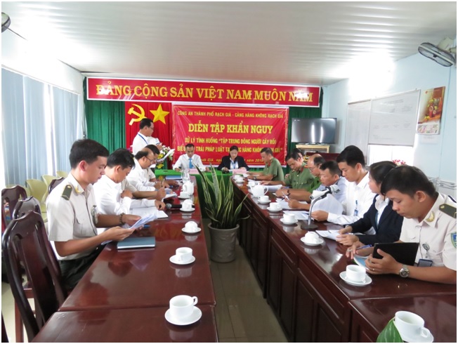 Công tác An ninh, an toàn trong hoạt động hàng không luôn được coi là mục tiêu quan trong hàng đầu vì đây là yếu tố quyết định đến uy tín, hiệu quả và sự phát triển bền vững của ngành hàng không - Diễn tập khẩn nguy cấp cơ sở 2019: ”Tập trung đông người, gây rối, biểu tình trái pháp luật tại Cảng hàng không Rạch Giá”.