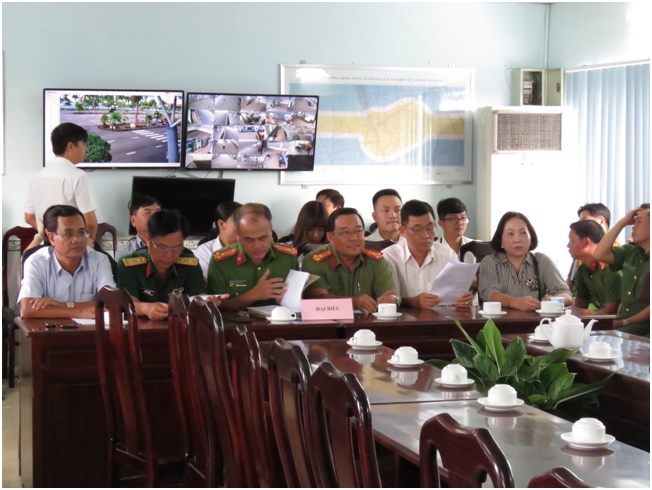 Đại biểu các ban ngành về dự buổi diễn tập khẩn nguy tại Cảng hàng không Rạch Giá: ông Nguyễn Văn Hôn – Phó chủ tịch UBND Tp. Rạch Giá; Đại diện Thành đội Tp. Rạch Giá; Thượng tá Danh Ngọc Thu – Trưởng Công an Tp. Rạch Giá; Thượng tá Nguyễn Thành Trung –– Phó Trưởng phòng An ninh đối nội Công an tỉnh Kiên Giang; bà Trang Thị Bích Ngọc – Phó Bí thư Thành ủy Tp. Rạch Giá.(thứ tự tính từ trái sang phải)