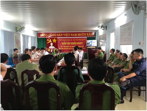 Với vai trò hết sức quan trọng trong quá trình phát triển kinh tế của cả nước nói chung và đối với mỗi địa phương tỉnh Kiên Giang nói riêng, đặc biệt Kiên Giang là tỉnh có tiềm năng phát triển về du lịch rất lớn. Công tác An ninh, an toàn trong hoạt động hàng không luôn được coi là mục tiêu quan trong hàng đầu vì đây là yếu tố quyết định đến uy tín, hiệu quả và sự phát triển bền vững của ngành hàng không, cũng như góp phần vào sự phát triển kinh tế, du lịch của địa phương. Để đảm bảo an toàn tuyệt đối trong hoạt động hàng không, công tác huấn luyện, đào tạo, tổ chức diễn tập ứng phó với các tình huống khẩn nguy luôn được Ban Lãnh đạo Cảng hàng không Rạch Giá coi trọng đến từng đơn vị cơ sở. Mục đích của công tác diễn tập nhằm nâng cao nhận thức của cán bộ, nhân viên về tầm quan trọng của công tác an ninh an toàn. Với mục tiêu để mỗi tập thể, cá nhân hiểu rõ chức năng nhiệm vụ của mình, nắm vững thứ tự hành động của mình phải thực hiện, cũng như nhằm hạn chế tới mức thấp nhất thiệt hại về người và tài sản khi có tình huống khẩn nguy xảy ra, Ban Lãnh đạo cảng đã phối hợp với Công an thành phố Rạch Giá – Công an tỉnh Kiên Giang tổ chức diễn tập kế hoạch khẩn nguy năm 2019 với hình thức: Vận hành cơ chế cấp cơ sở với tình huống: “ Tập trung đông người gây rối, biểu tình trái pháp luật tại Cảng hàng không Rạch Giá”, nội dung giả định như sau: