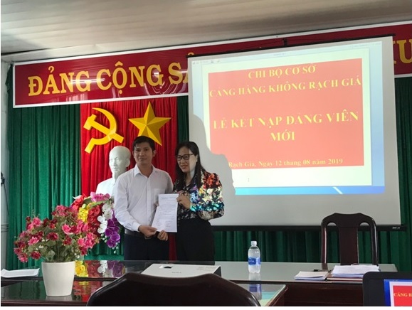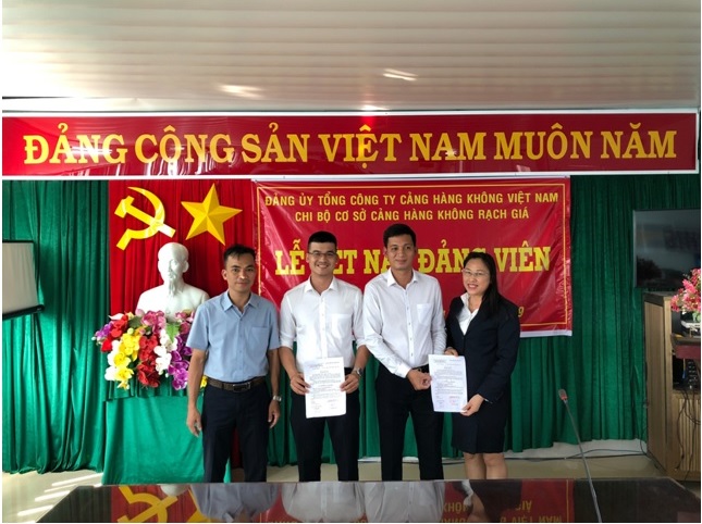 Được sự nhất trí của Đảng ủy Tổng Công ty Cảng hàng không Việt Nam sáng ngày 12 tháng 8 năm 2019 và ngày 12 tháng 11 năm 2019 Chi ủy Chi bộ cơ sở Cảng hàng không Rạch Giá đã long trọng tổ chức Lễ kết nạp đảng viên mới cho quần chúng ưu tú Ngô Trung Hậu- Đội Phục vụ hành khách, Hoàng Thanh Tâm- Nhân viên Văn phòng và Dương Xuân Lợi – Nhân viên Đội An ninh hàng không vào Đảng Cộng sản Việt Nam.