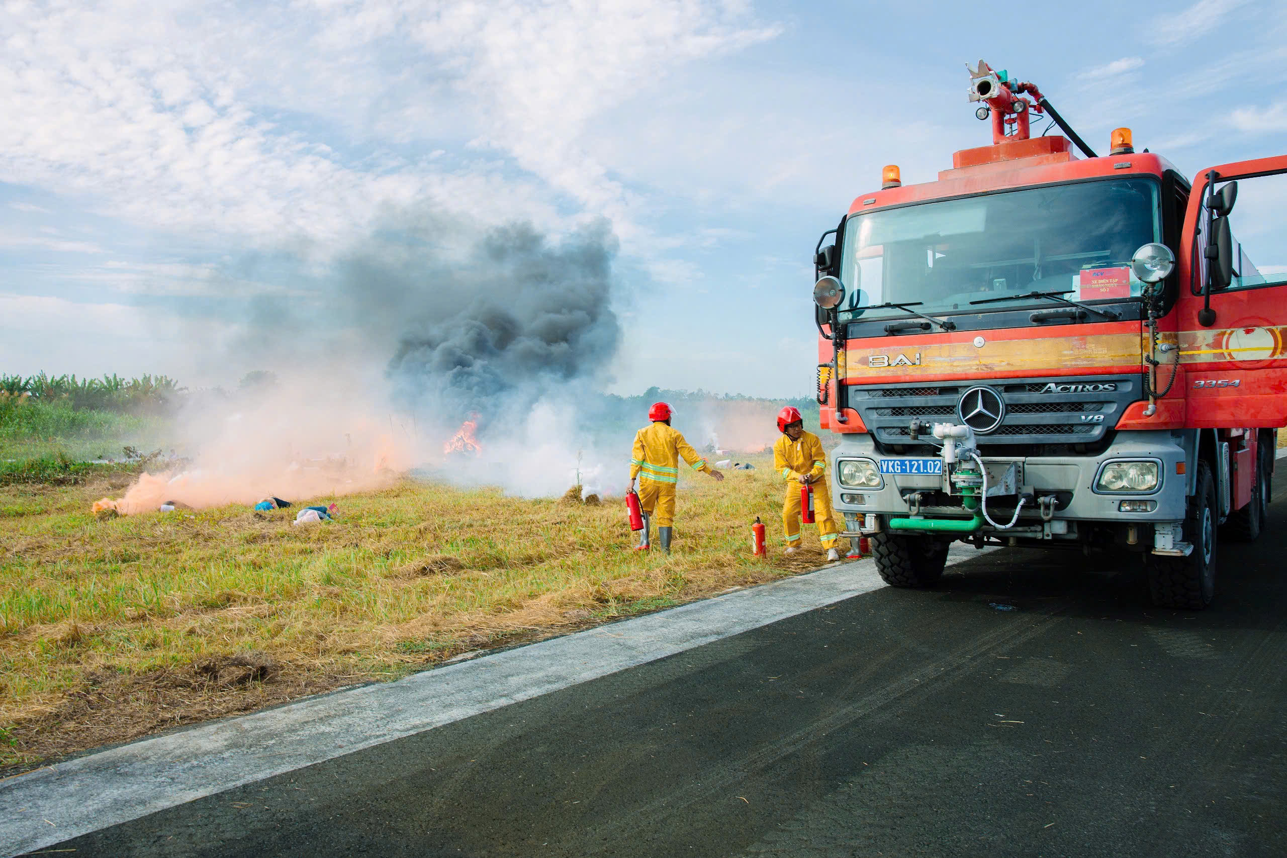 Một tàu bay gặp sự cố động cơ và phải hạ cánh khẩn cấp. Sau khi hạ cánh, tàu bay trượt khỏi đường băng, gây cháy lớn và lao xuống hồ điều hòa phía Đông sân bay.
