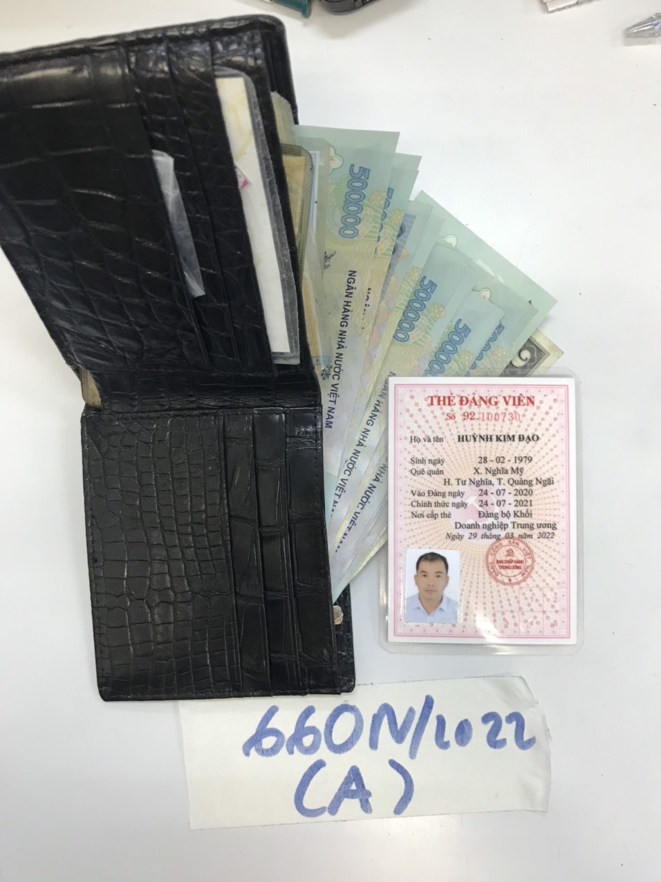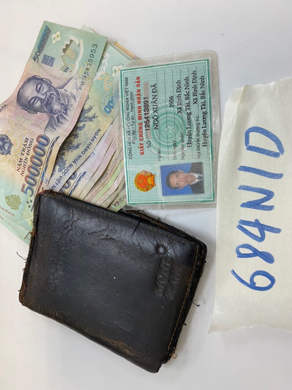 Ngày tiếp nhận: 21/8/2022 Mô tả: 01 ví nâu có 05 tờ 500.000vnd, 06 tờ 200.000vnd, 01 tờ 100.000vnd, 02 tờ 20.000vnd, 02 tờ 10.000vnd, 01 CMND tên Ngô Xuân Đã. Vị trí: An ninh soi chiếu quốc nội |