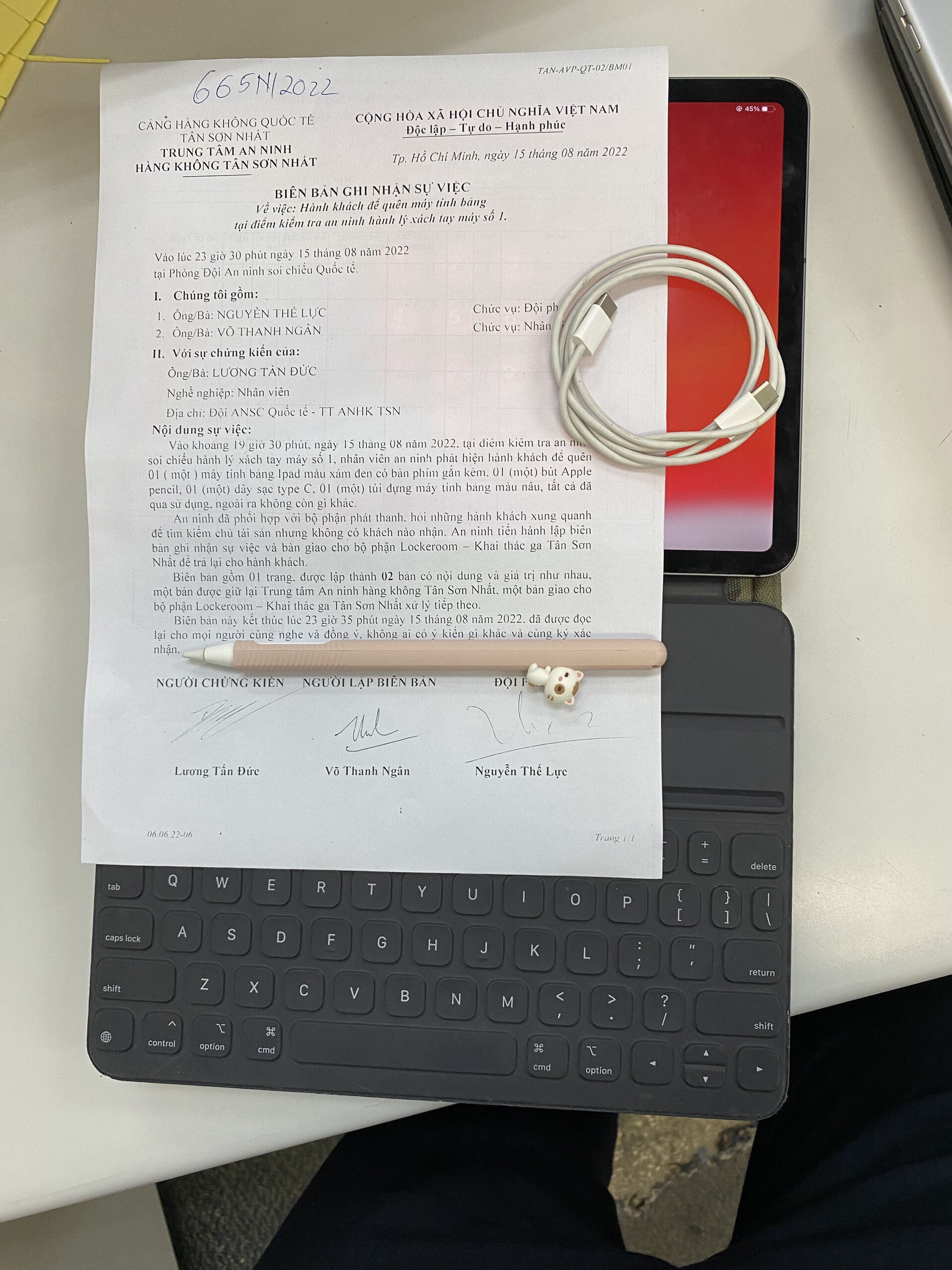 Ngày tiếp nhận: 19/8/2022 Mô tả: 01 Ipad màu xám đen, 01 bàn phím, 01 bút pencil, 01 dây sạc type C, 01 túi nâu. Vị trí: An ninh soi chiếu quốc tế |