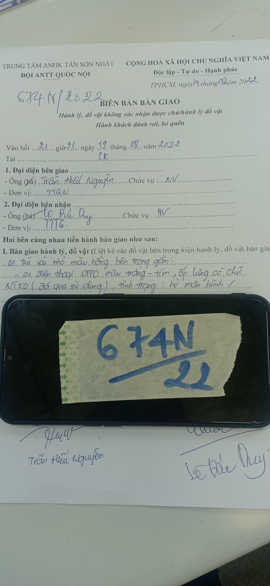 Ngày tiếp nhận: 21/8/2022 Mô tả: 01 điện thoại màu xanh Vivo. Vị trí: An ninh soi chiếu quốc nội |