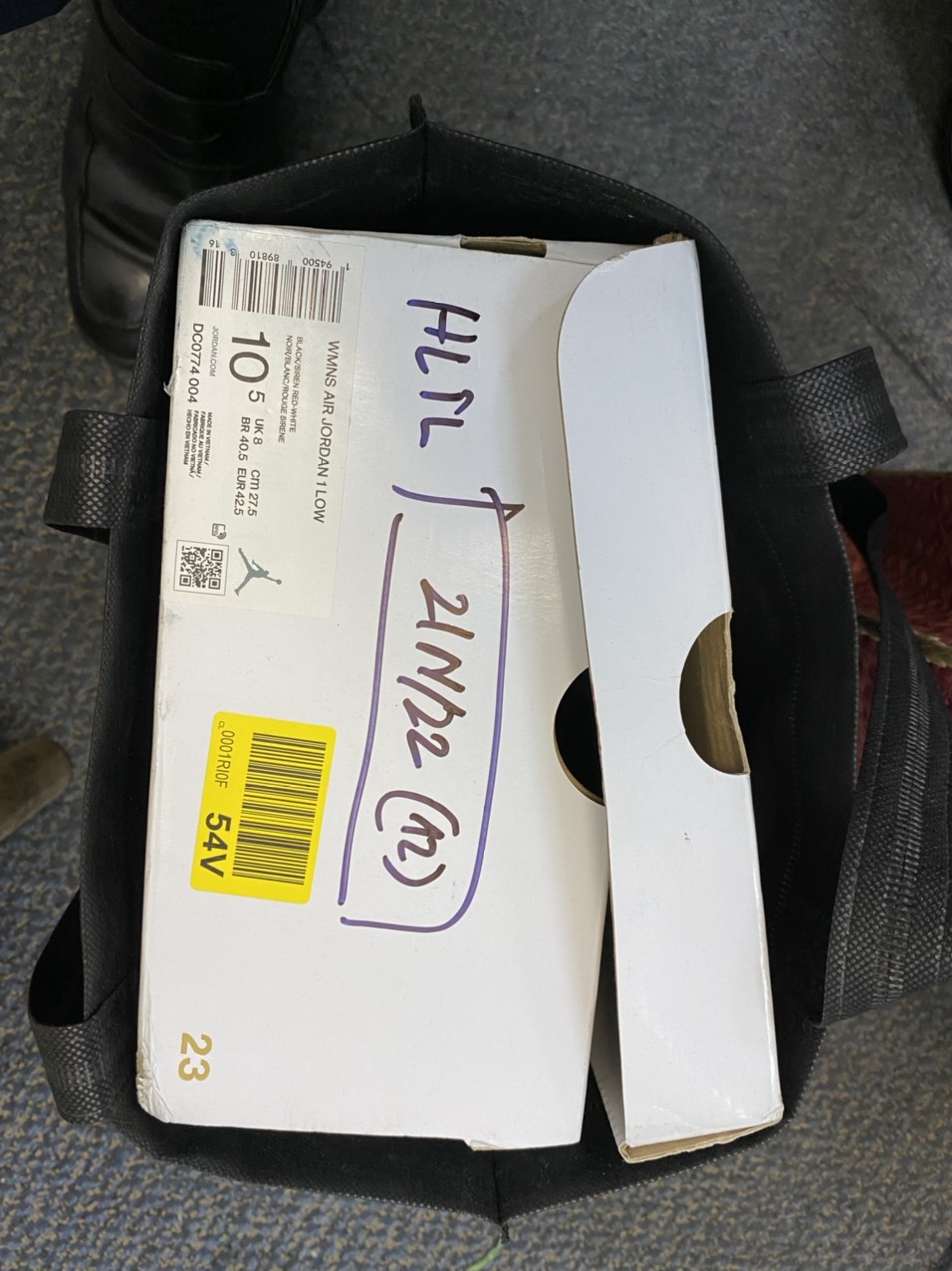 Ngày tiếp nhận: 20/01/2022 Mô tả: 01 Hộp giày màu trắng có 01 đôi giày màu đen đỏ. Vị trí: An ninh soi chiếu quốc nội |