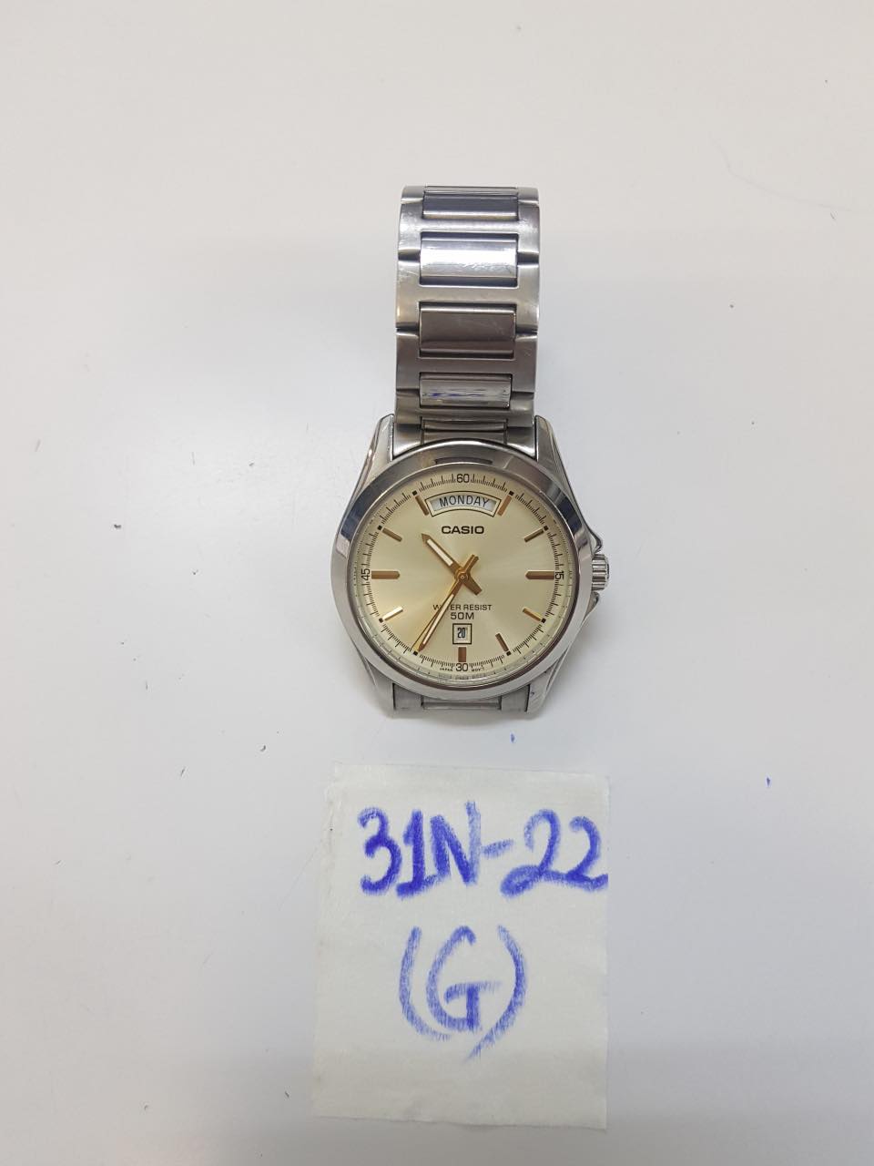 Ngày tiếp nhận: 23/01/2022 Mô tả: 01 đồng hồ kim loại màu trắng có ghi chữ CASIO đã qua sử dụng. Vị trí: An ninh soi chiếu quốc nội |