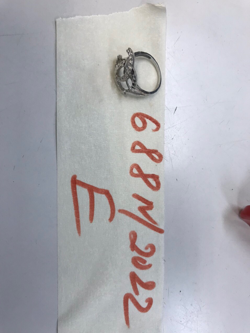 Ngày tiếp nhận: 23/8/2022 Mô tả: 01 nhẫn kim loại trắng có đính đá trắng. Vị trí: An ninh soi chiếu quốc nội |