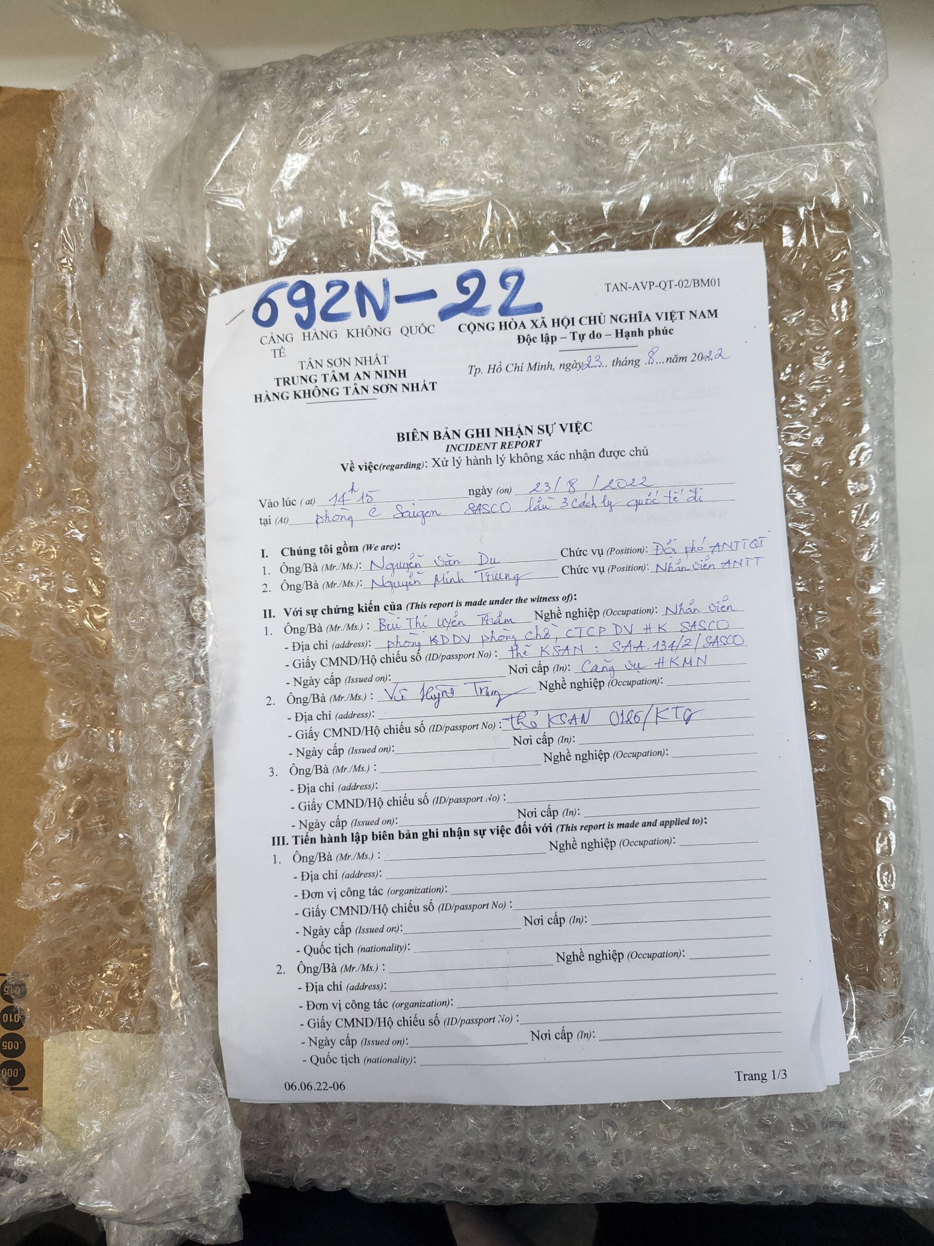 Ngày tiếp nhận: 27/8/2022 Mô tả: 01 túi nhựa màu xanh có quần áo. Vị trí: An ninh soi chiếu quốc nội |