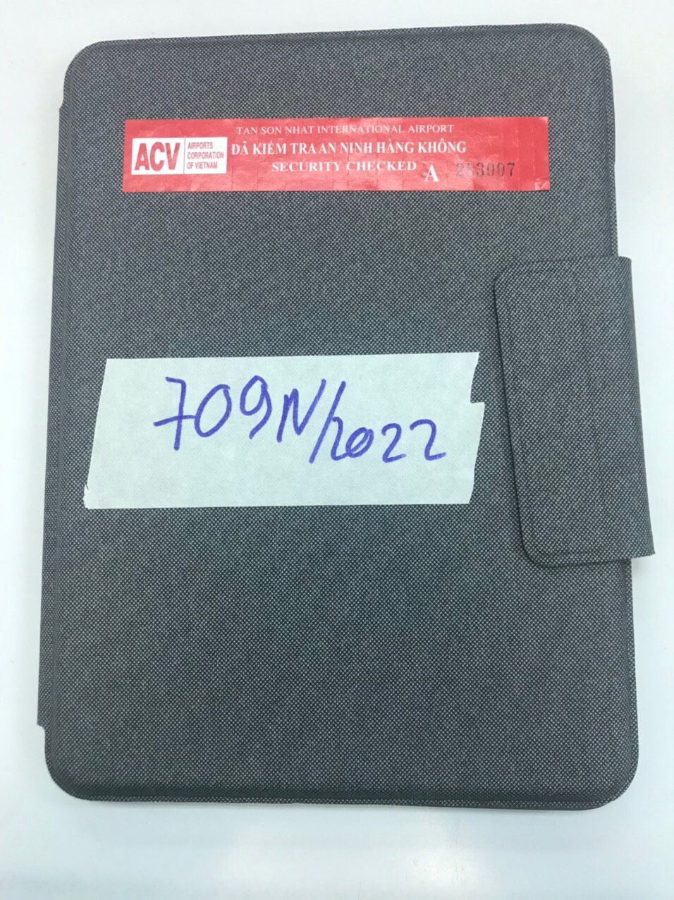 Ngày tiếp nhận: 26/8/2022 Mô tả: 01 laptop màu xám có nhiều hình dán trên máy. Vị trí: An ninh soi chiếu quốc tế |