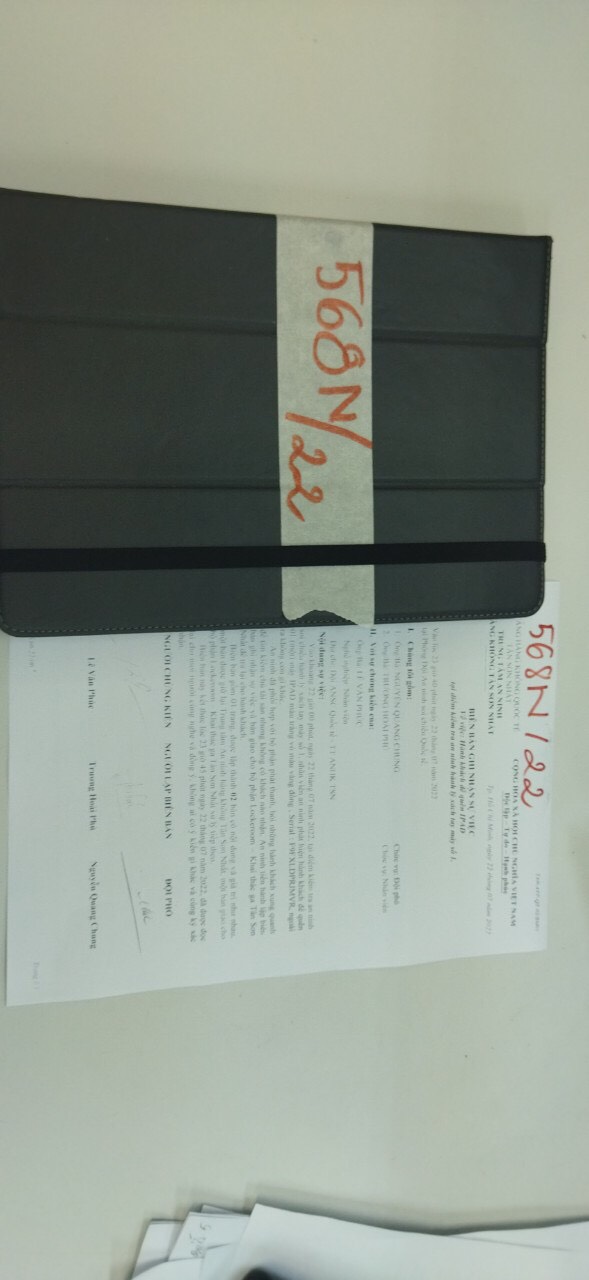 Ngày tiếp nhận: 27/07/2022 Mã hồ sơ: 580N2022 Mô tả: 01 Túi vải màu trắng bên trong có: - Một máy tính bảng màu đen hiệu SAMSUNG - Một IPAD màu xám số series: 0MGWTKX4J85 - Một số quần áo và đồ dùng cá nhân đã qua sử dụng. Vị trí: An ninh soi chiếu quốc nội |