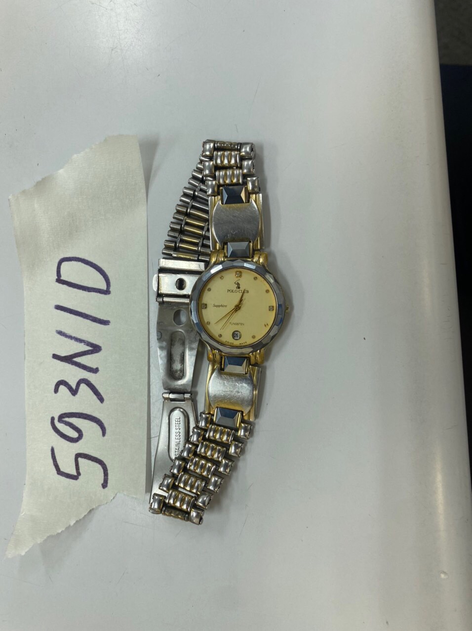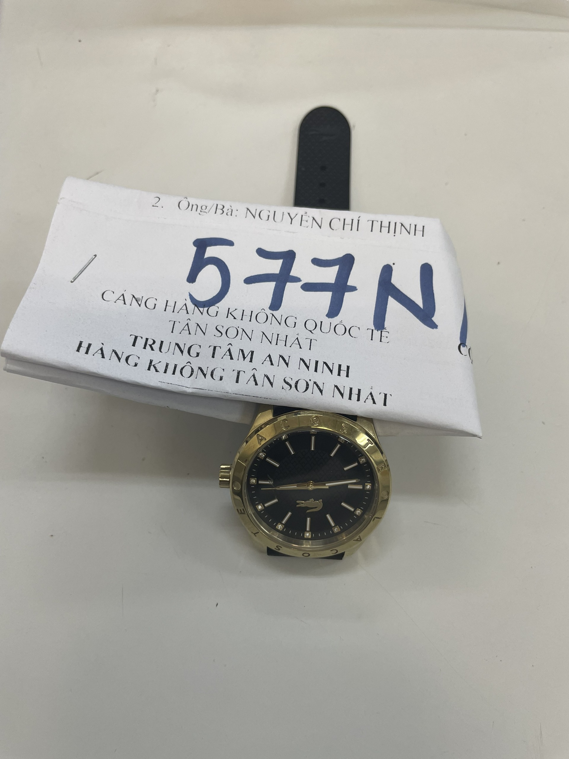 Ngày tiếp nhận: 27/07/2022 Mã hồ sơ: 577N2022 Mô tả: 01 đồng hồ màu vàng có chữ LACOSTE dây nhựa màu đen. Vị trí: An ninh soi chiếu quốc tế |