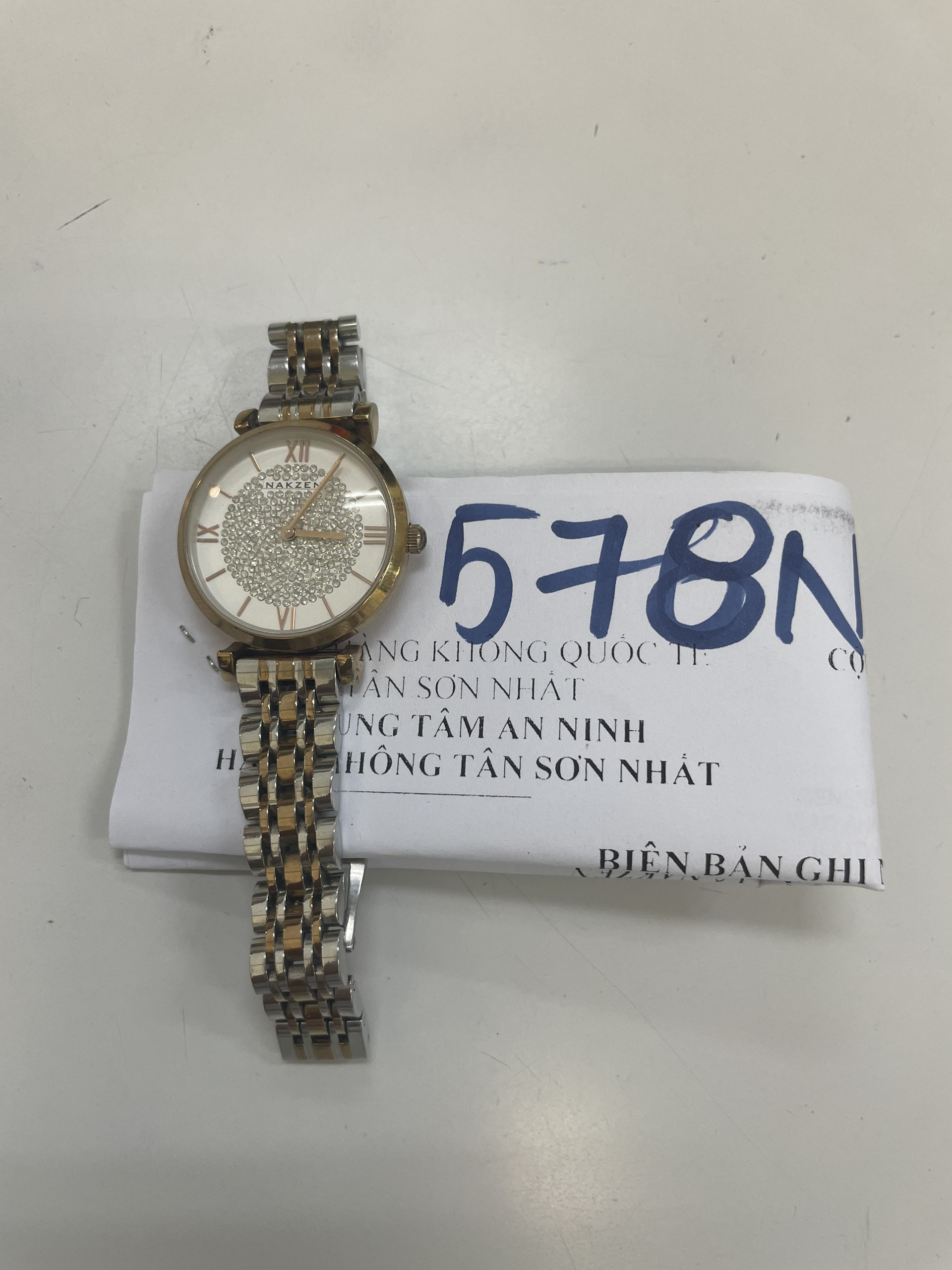 Ngày tiếp nhận: 27/07/2022 Mã hồ sơ: 578N2022 Mô tả: 01 đồng hồ kim loại màu vàng có chữ NAKZEN mã số 4056L. Vị trí: An ninh soi chiếu quốc tế |