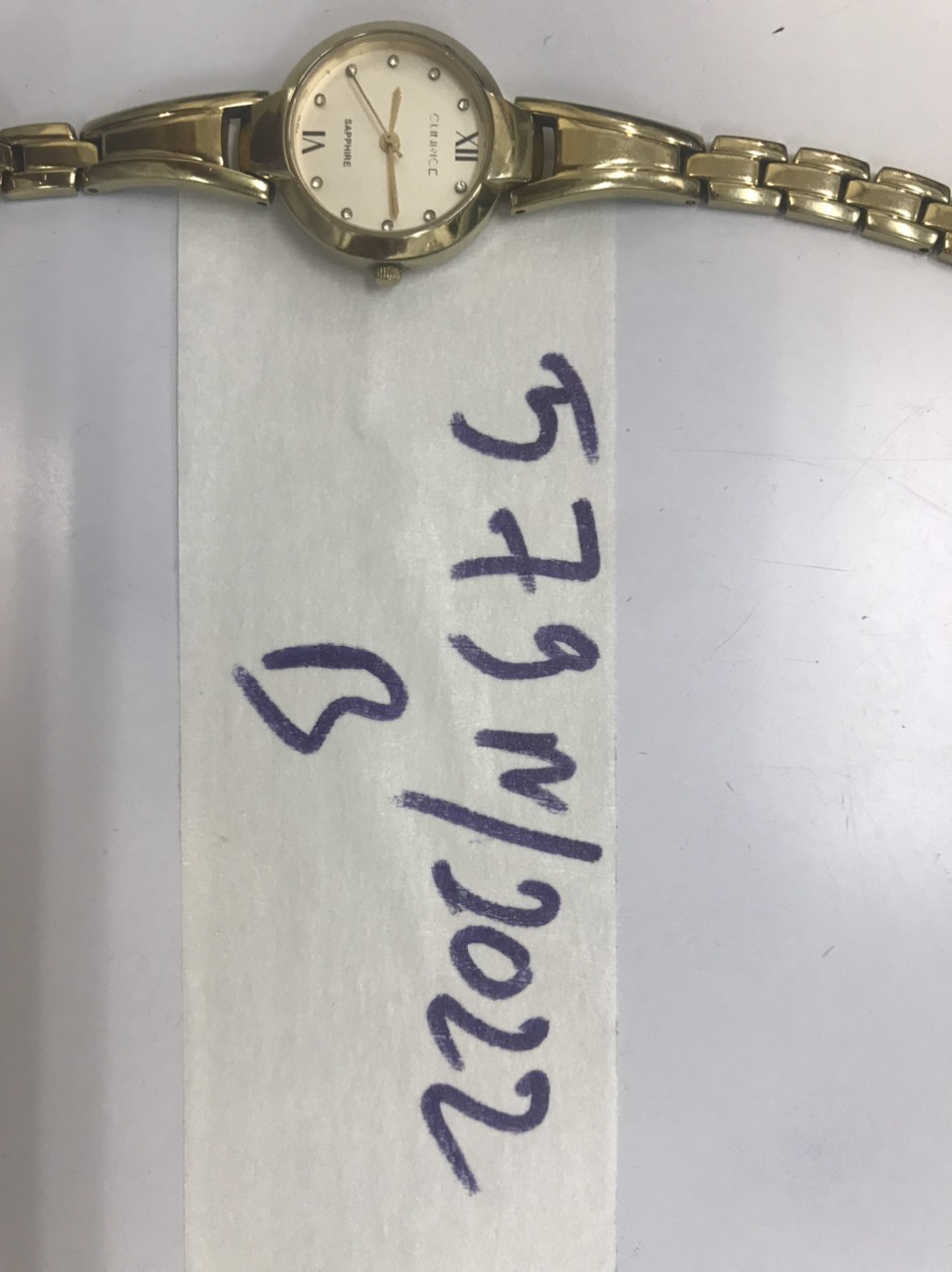 Ngày tiếp nhận: 27/07/2022 Mã hồ sơ: 579N2022B Mô tả: 01 đồng hồ kim loại màu vàng SUNRISE. Vị trí: An ninh soi chiếu quốc nội |