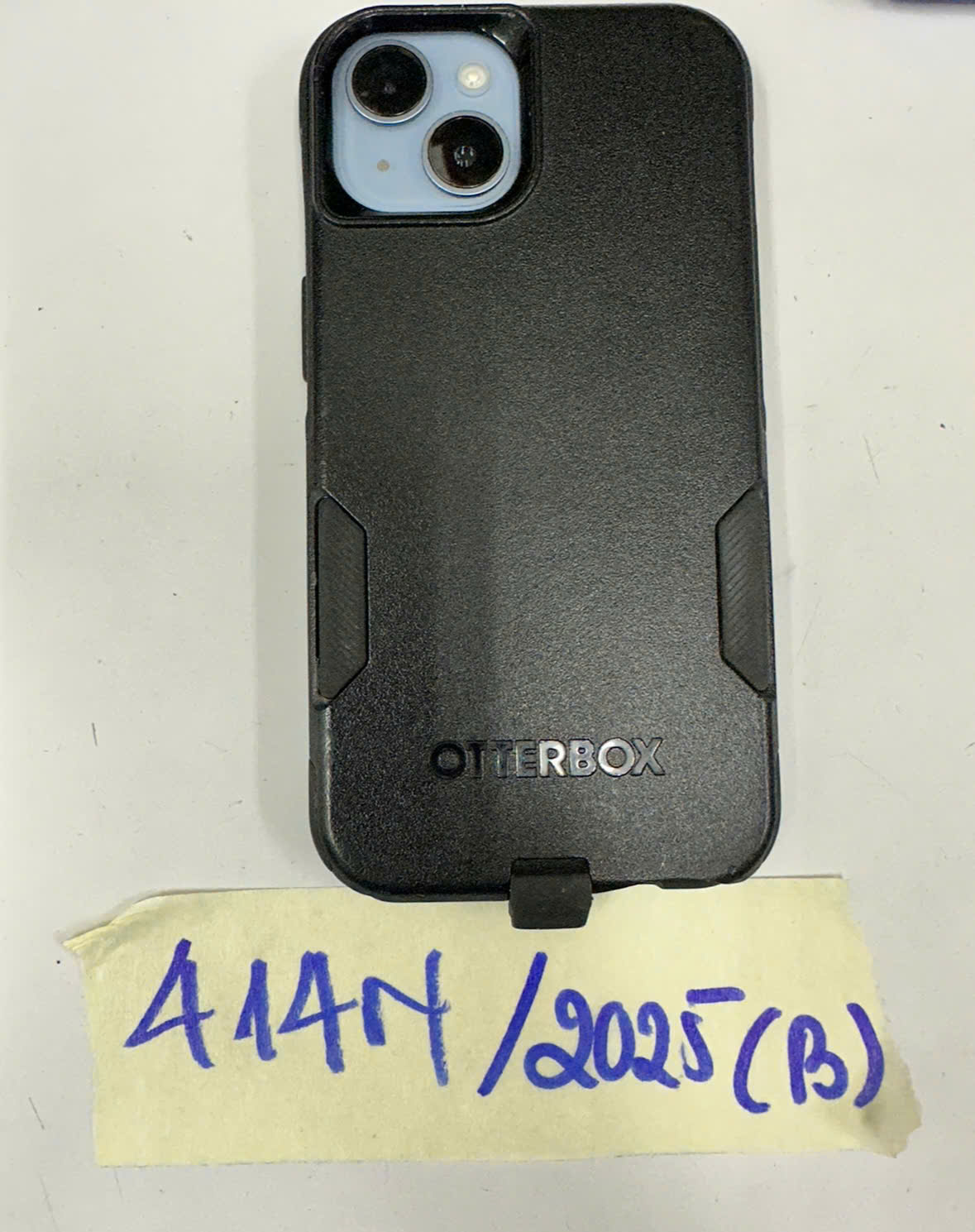 Ngày tiếp nhận: 02/03/2025 Mã hồ sơ: 414N2025B Mô tả: 01 Điện thoại Iphone màu xanh dương có ốp lưng màu đen in dòng chữ OTTERBOX. |
