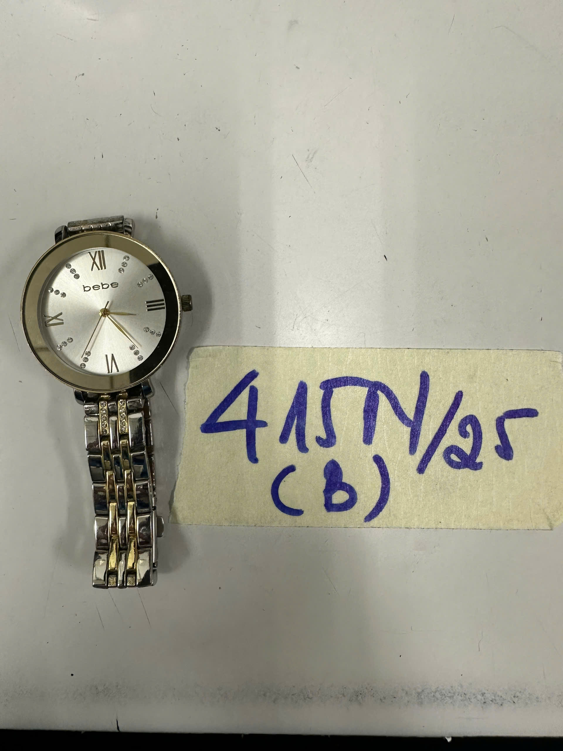 Ngày tiếp nhận: 02/03/2025 Mã hồ sơ: 415N2025B Mô tả: 01 đồng hồ màu trắng có chữ "bebe" dây kim loại màu trắng/ vàng. |