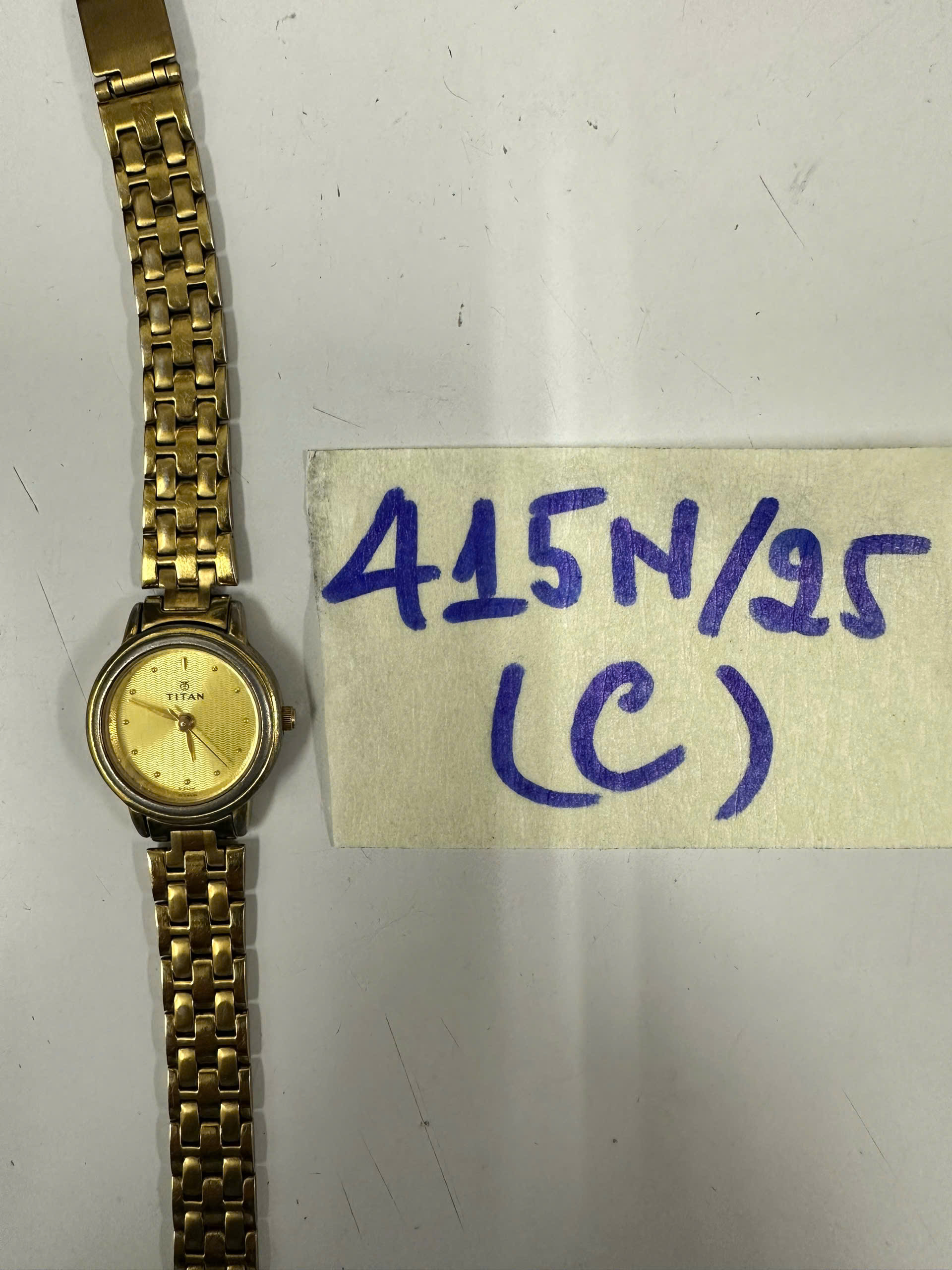 Ngày tiếp nhận: 02/03/2025 Mã hồ sơ: 415N2025C Mô tả: 01 đồng hồ màu vàng có chữ "Titan", , dây kim loại màu vàng. |