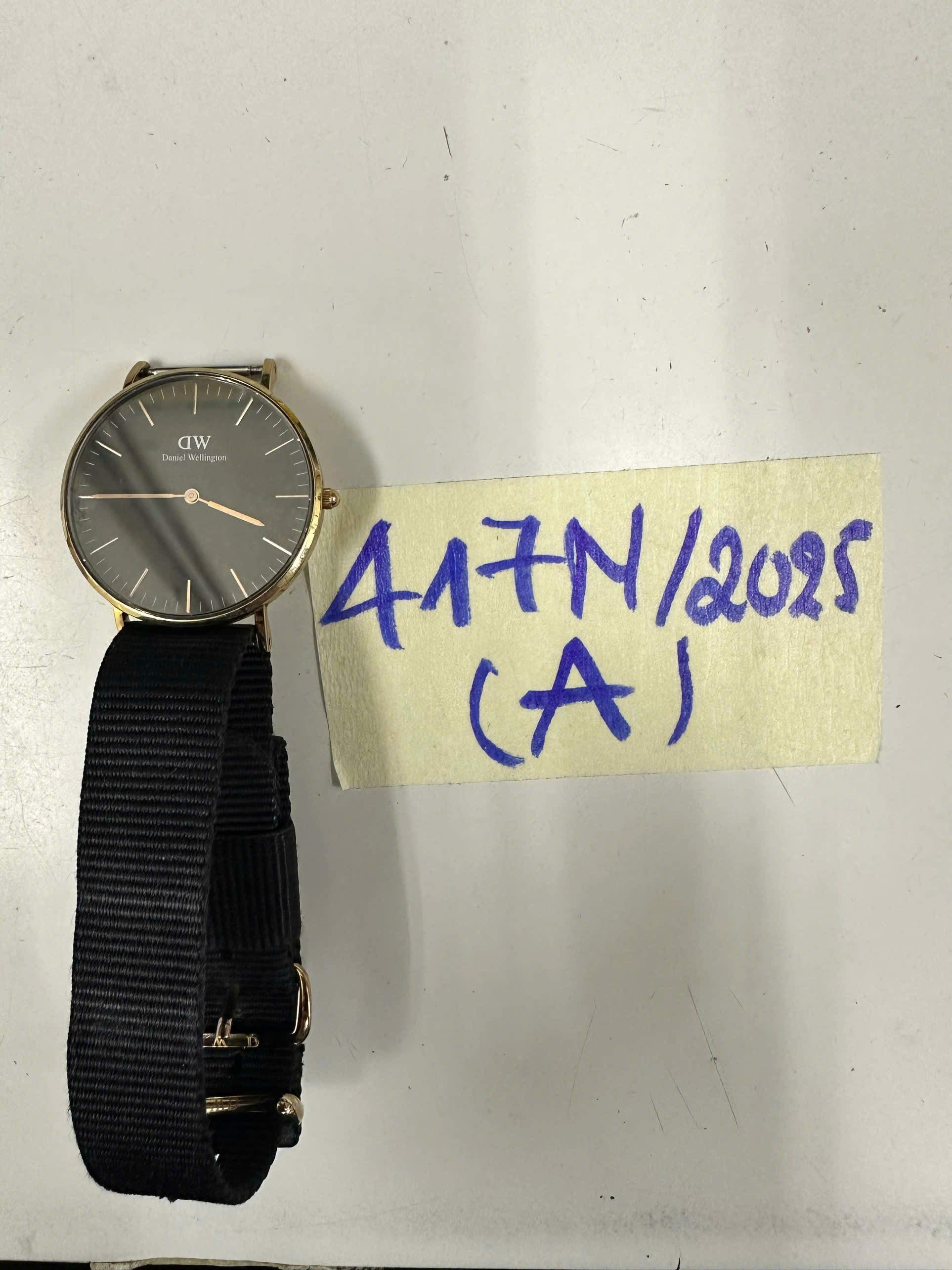 Ngày tiếp nhận: 02/03/2025 Mã hồ sơ: 417N2025A Mô tả: 01 đồng hồ màu đen mặt tròn, dây vải màu đen, trên mặt đồng hồ có chữ "Daniel Wellington". |
