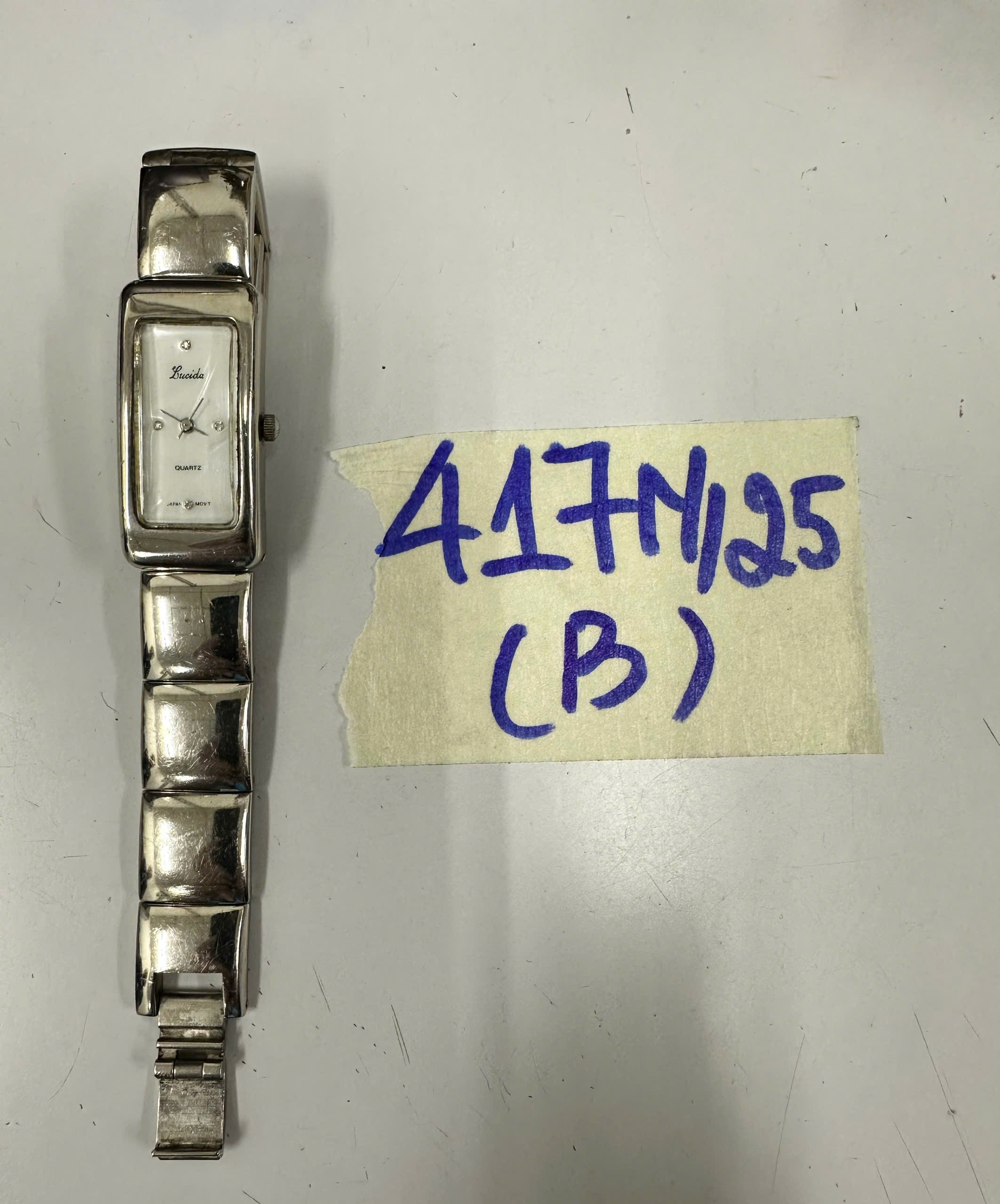 Ngày tiếp nhận: 02/03/2025 Mã hồ sơ: 417N2025B Mô tả: 01 đồng hồ mặt chữ nhật bằng kim loại, dây bằng kim loại màu bạc, trên mặt đông hồ có chữ "Lucida". |