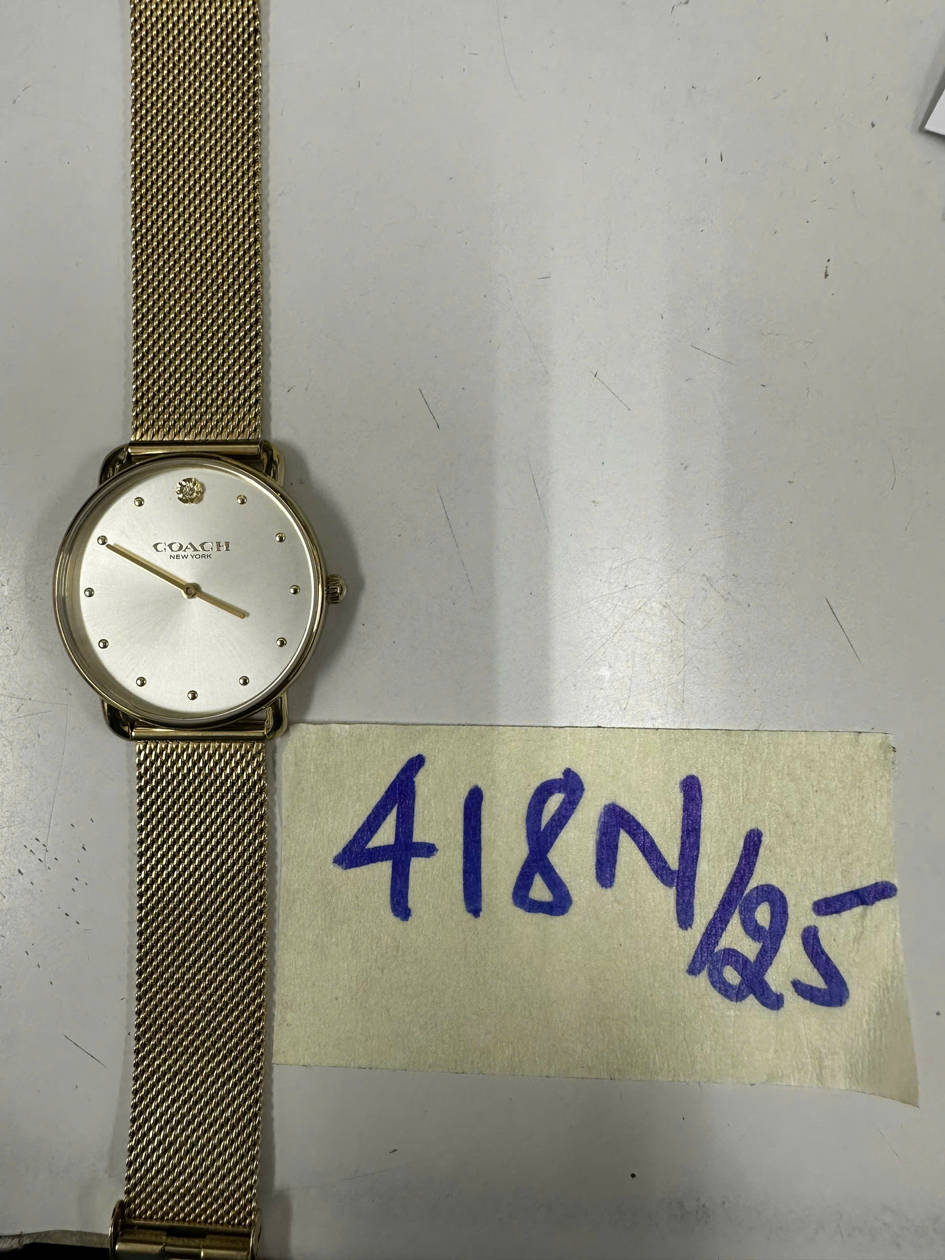 Ngày tiếp nhận: 02/03/2025 Mã hồ sơ: 418N2025 Mô tả: 01 đồng hồ kim loại màu vàng chữ Coach. |