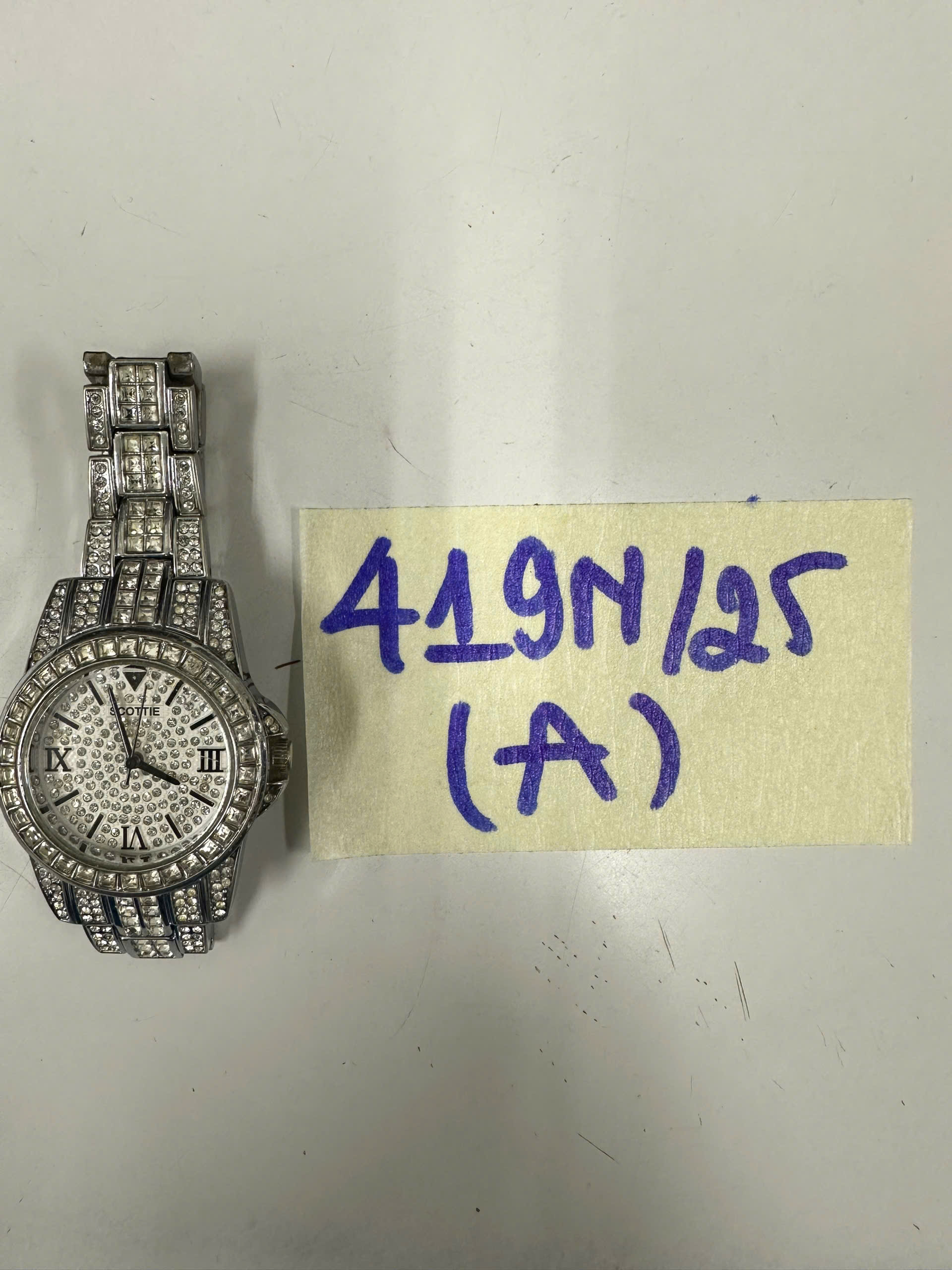 Ngày tiếp nhận: 02/03/2025 Mã hồ sơ: 419N2025A Mô tả: 01 đồng hồ đeo tay bằng kim loại màu trắng, mặt có chữ SCOTTIE, đính đá mặt và dây đeo, mặt sau có chữ NO: 9182. |