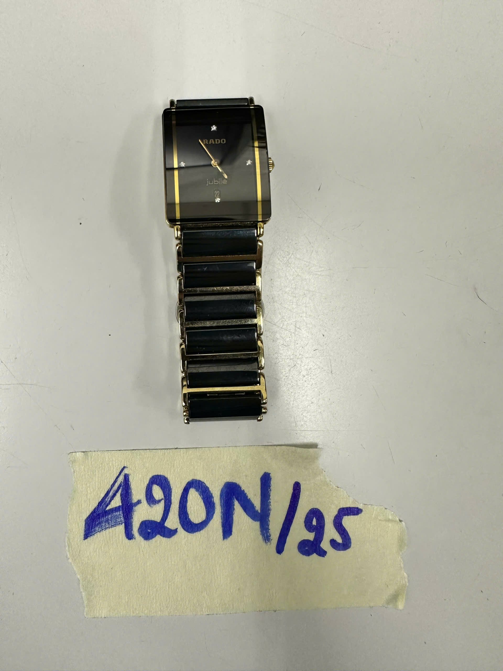Ngày tiếp nhận: 02/03/2025 Mã hồ sơ: 420N2025 Mô tả: 01 đồng hồ kim loại mặt chữ nhật, màu đen xen màu vàng kim loại, trên mặt đồng hồ có chữ "Rado Jubile". |