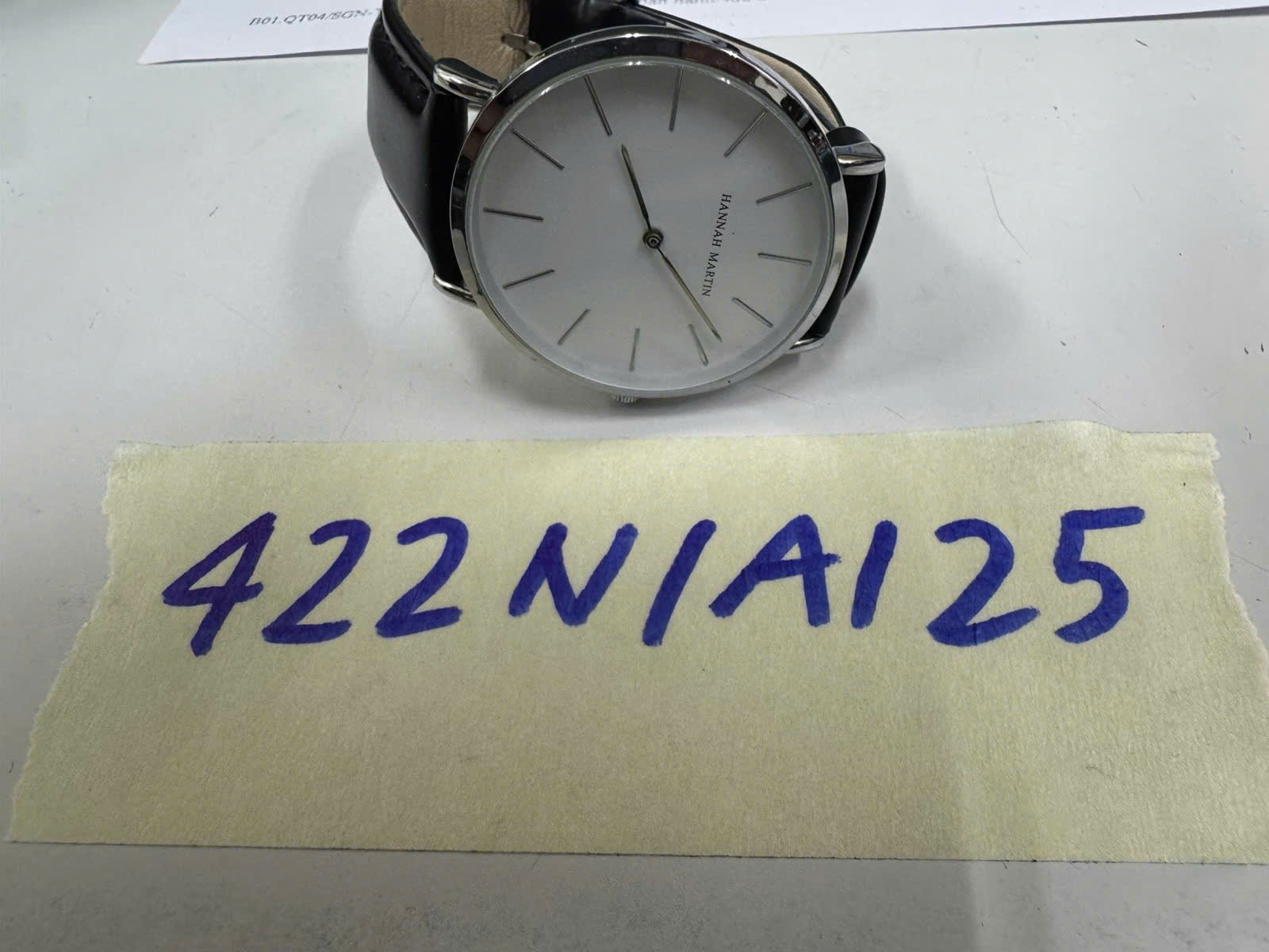 Ngày tiếp nhận: 02/03/2025 Mã hồ sơ: 422N2025A Mô tả: 01 đồng hồ mặt kim loại trờn màu trắng, dây da màu đen, trên mặt đồng hồ có chữ HANNAH MARTIN. |