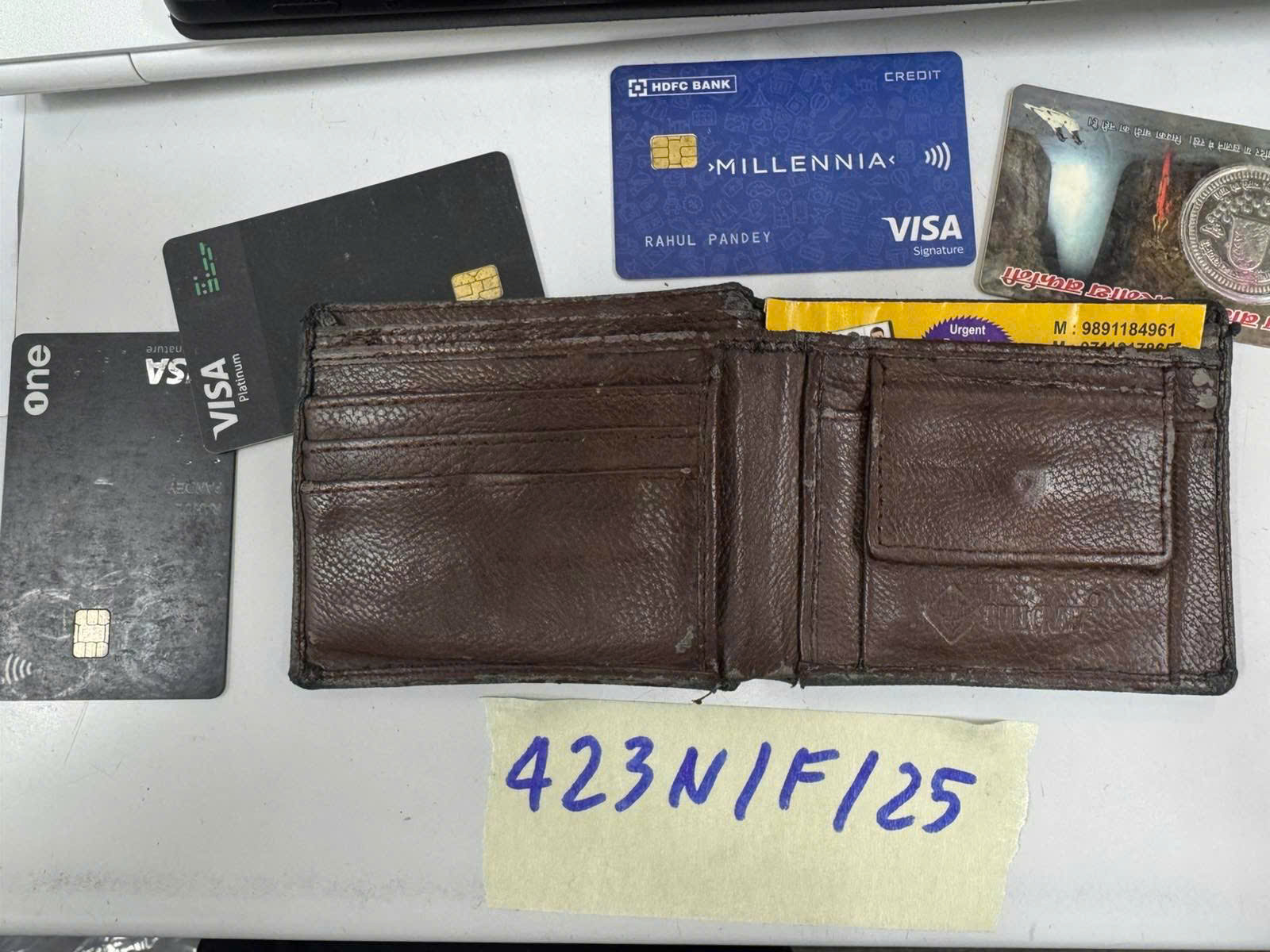 Ngày tiếp nhận: 02/03/2025 Mã hồ sơ: 423N2025F Mô tả: 01 ví tiền màu nâu có chữ "BullC rafi" bên trong có: 03 (ba) thẻ Visa có tên "Rahul Pandey ngoài ra không còn vật giá trị nào. |