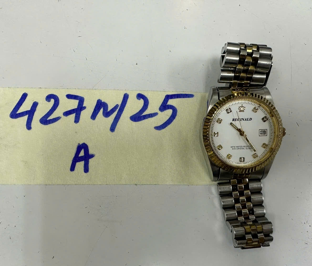 Ngày tiếp nhận: 02/03/2025 Mã hồ sơ: 427N2025A Mô tả: 01 đồng hồ dây kim loại màu bạc, mặt tròn màu trắng viền vàng ghi chữ “REGINALD". |