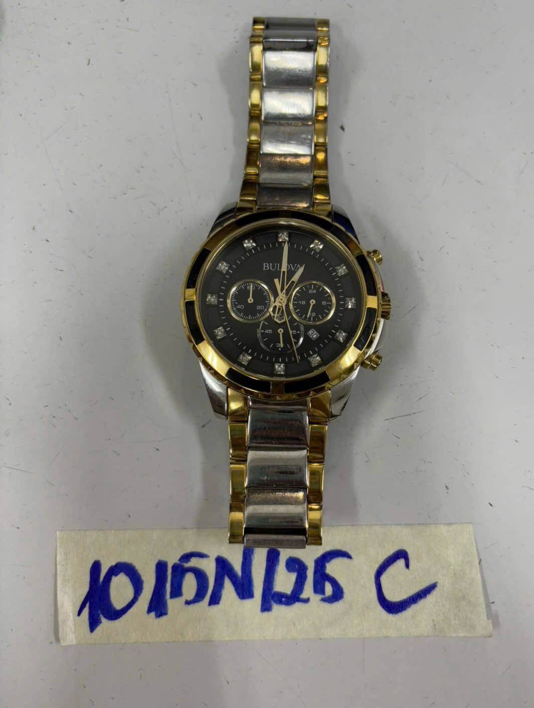 Ngày tiếp nhận: 03/6/2025 Mã hồ sơ: 1015N2025C Mô tả: 01 đồng hồ đeo tay kim loại màu trắng/ vàng, mặt đồng hồ hình tròn có chữ BULOVA, dây kim loại màu trắng/ vàng. |