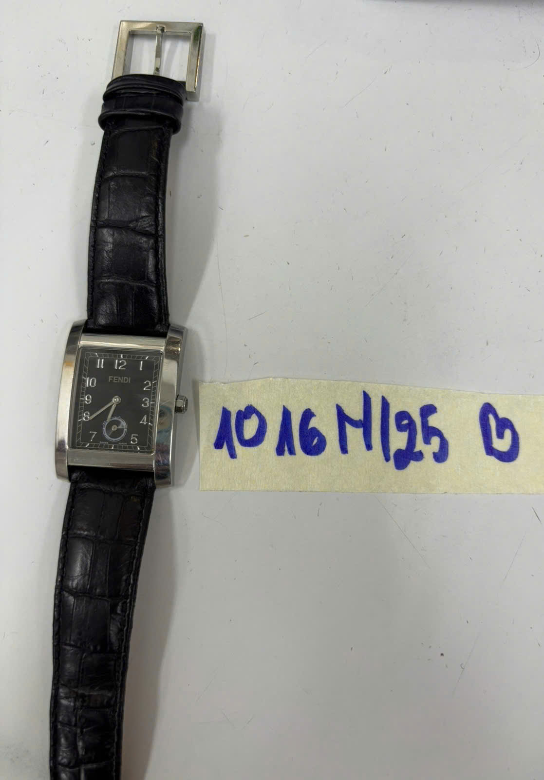 Ngày tiếp nhận: 03/6/2025 Mã hồ sơ: 1016N2025B Mô tả: 01 đồng hồ đeo tay màu đen, mặt đồng hồ hình chữ nhật logo chữ FENDI, dây bằng da. |