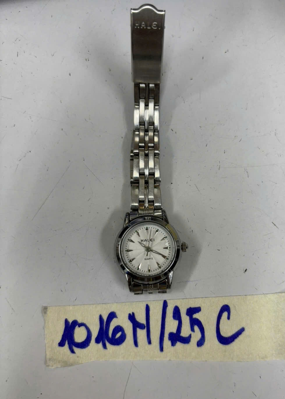 Ngày tiếp nhận: 03/6/2025 Mã hồ sơ: 1016N2025C Mô tả: 01 đồng hồ đeo tay bằng kim loại, mặt đồng hồ hình tròn có logo chữ HALEI. |
