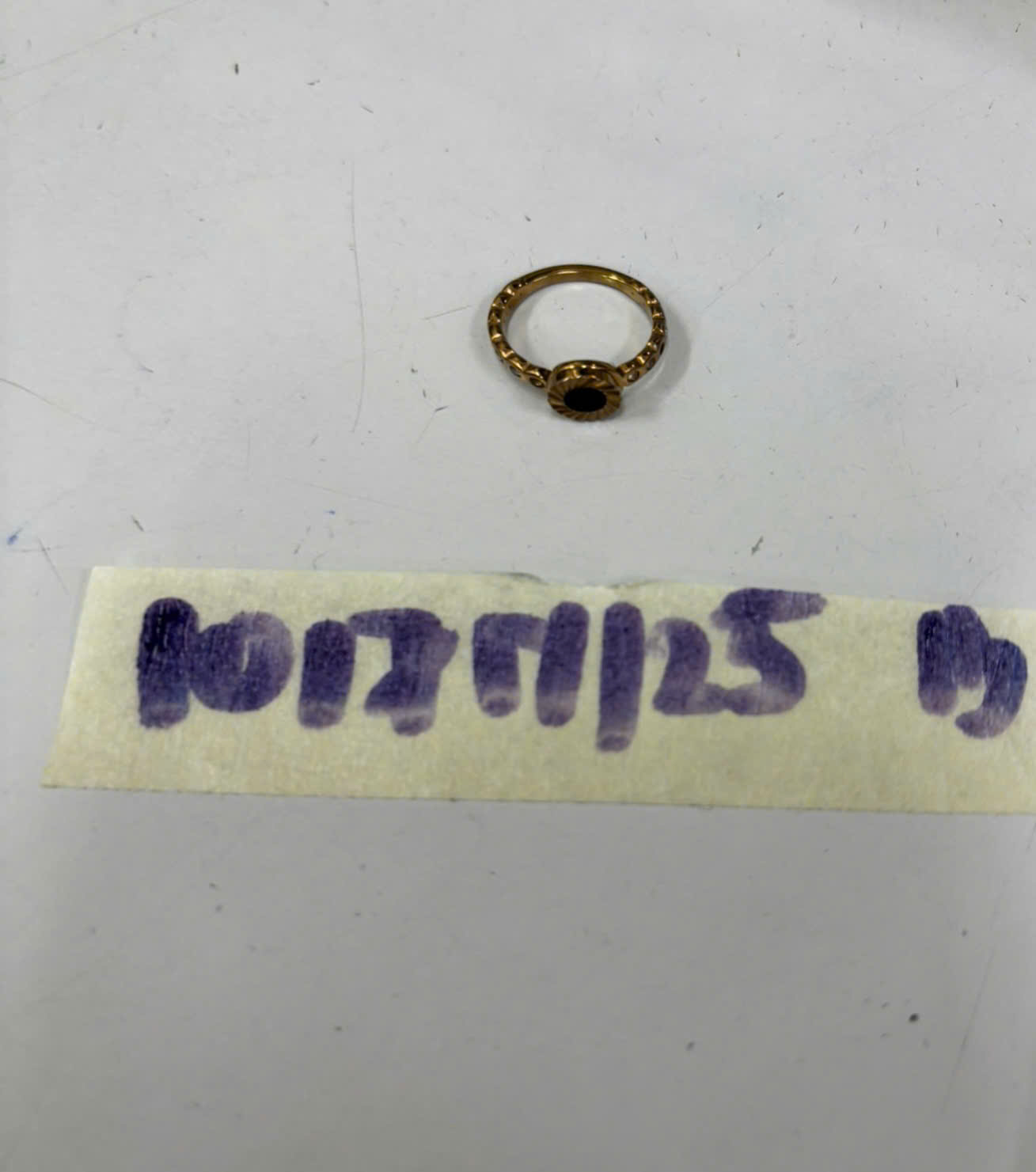 Ngày tiếp nhận: 03/6/2025 Mã hồ sơ: 1017N2025B Mô tả: 01 nhẫn màu nâu, mặt nhẫn có đính hạt màu đen. |